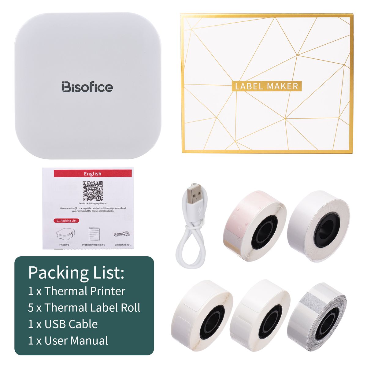 1 x Thermal Printer,5 x Thermal Label Roll,1 x USB Cable,