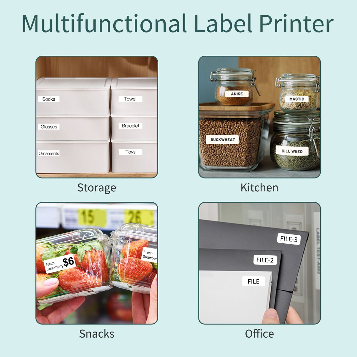 Multifunctional Label Printer - Mini and portable label printer able to print various stickers such as prince tag, text, icon, frame, picture, time, 1D code, QR code, line etc. Widely used in home storage, makeup remark, journal making, office, study.