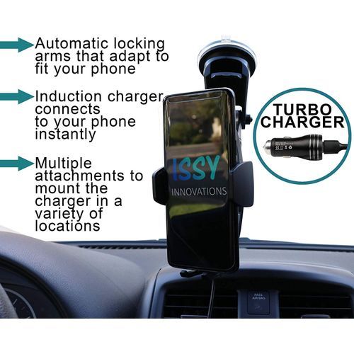 Innovations, we strive to bring the highest quality products to your door. Designed in the USA, our new ISSY Automatic Clamping Wireless Car Charger will keep your phone powered hands free. Featuring automatic arms, for a tight and safe grip so you don’t have to worry about those bumpy roads anymore. Our Package includes a full mounting accessory kit, USB Type-C cable and a ISSY QC 3. 0 Quick Charge Car Charger Adaptor for the fastest charge suitable to your phone. INSTRUCTIONS – TO USE THE ISSY AUTOMATIC CLAMPING WIRELESS CAR CHARGER ✔ Plug in the provided ISSY QC 3. 0 Quick Charge car charger adaptor into your car. ✔ Simply choose the Window/Dashboard Mount or the Air Vent Mount. ✔ Attach the mount into the back of the socket and screw the provided plas nut to secure. ✔ Once secure place the chosen mount into the location of your choice – for the air vent mount clip into the air vent, for the suction mount clip down the clip on the suction mount onto your chosen location. ✔ Plug the provided USB Type-C cable into bottom of the ISSY Wireless Charger. ✔Plug the USB socket end of the USB Type-C cable into the ISSY QC 3. 0 Quick Charge car charger adaptor. ✔ Place your phone onto the ISSY Wireless Charger and enjoy Fast Wireless Charging. PLEASE NOTE 1 For larger phone you may have to extend the bottom foot to find the perfect spot for wireless charging. 2 For the full power of the wireless charger do not fit cases thicker than 0. 23inch/6mm and avoid any materials including Metal rings, metal plates, magnets into the backside of the phone case. 3 Please use the provided ISSY QC 3. 0 car charger adapter for 10W, 7. 5W fast charging mode. |