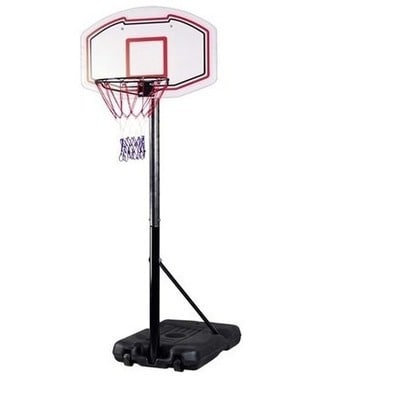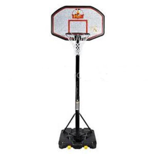 Movable basketball post with roller tires. It comes with components like board, ring and net. Suitable for both indoors and outdoor use, home use, schools, sport centres, recreational centers