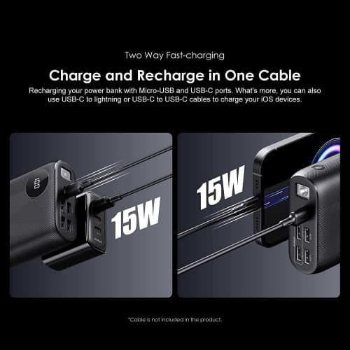 - Inputs (Micro USB) and USB OutputNot only the traditional Micro USB cable, you can also use the Type-C cable to charge the power bank
