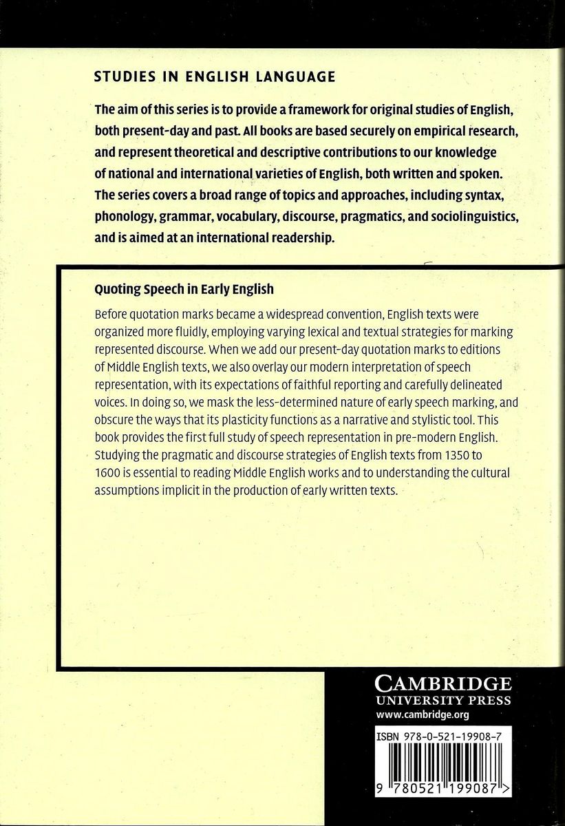 Before quotation marks became a widespread convention, English texts were organized more fluidly, employing varying lexical and textual strategies for marking represented discourse. When we add our present-day quotation marks to editions of Middle English texts, we also overlay our modern interpretation of speech representation, with its expectations of faithful reporting and carefully delineated voices. In doing so, we mask the less-determined nature of early speech marking, and obscure the ways that its plasticity functions as a narrative and stylistic tool. This book provides the first full study of speech representation in pre-modern English. Studying the pragmatic and discourse strategies of English texts from 1350 to 1600 is essential to reading Middle English works and to understanding the cultural assumptions implicit in the production of early written texts.