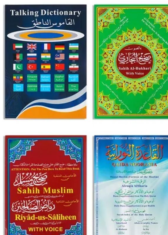 Both struggling and fluent readers rapidly improve their skills in fluency,vocabulary,comprehension,spelling,pronounciation and grammatical structure. This Pen can read any verse ,surah,and page of the Holy Quran book by just touching the Pen pointer at any verse ,surah title and page number. The Holy Quran Book is printed with authenthic and beautiful Othmani Text. Choose among the famous Quran voice recitations. Prominent translation voices synchronized with Holy Quran recitations. Repeat any verse ,surah, page just by pressing repeat button.Clear loud sound from the built in speakers. Beautiful pen with built-in speaker and rechargeable battery,4GB Built-in flash memory.PC connection,USB allows the users to connect with the PC .Effective working time after fully charged:over 6 hours.It will automatically power off if not in use for 3 minute,working temperature:-45 to+45.Recording voice for comparism of recitation .User can select any reciter of choice. Selection of audio translations in different languages like English,French,Urdu,Persian e.t.c. Enjoy recitation voices,12 different reciters, such as Al-Sudais,Al Afasy,Al Hussary,Abdul Basit,Al Hudhayfy,Al Mishawiy,e.t.c.Other books in the package include Sahih Muslim,Sahih Bukhari,Qaida Noronia:to learn Arabic alphabets,and talking dictionary.Package accessorries:USB cable, USB adapter,earphone,user manual, WHAT A PRECIOUS GIFT FOR THE BELOVED!!!