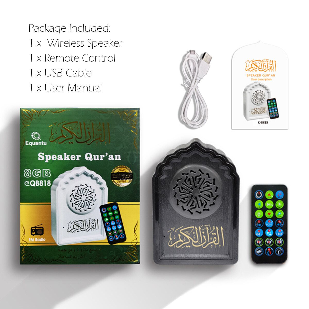 Main Function: Quran playback,19 reciters,15 languages, FM radio, remote control