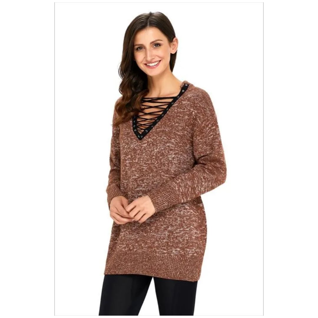 The v neck sweater with the criss cross design is very special and sexy Pullover sweater with long sleeve is very casual and basic The tunic sweater can cover wearer bottom and modify figure It is versatile and perfect to match with jeans, pants, leggings.