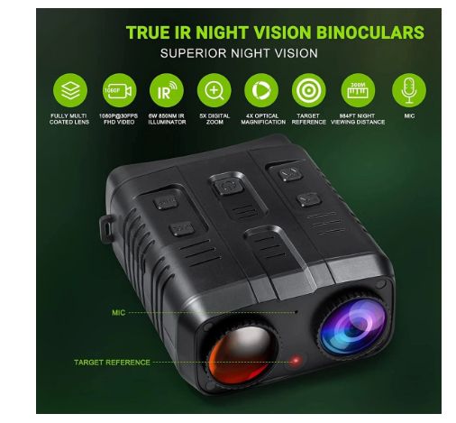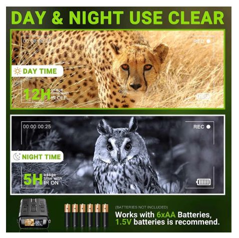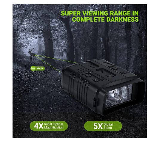Digital Infrared Night Vision binocular 5X Digital Zoom Full Colored Night Vision 2.4" Display Screen Playback for CampingThis digital night device is designed for both day and night use. It has photo,video and playback functions.The5X digital Zoomallow you to view objects clearly.With a special infrared illuminator,the user can see distant target in full darkness from164 yards to 1093 yards.It is perfectly used for camping, hiking, caving,animal observation and other nighttime activities.Feature:1. Powerful night vision scope,5x Zoom, long range viewing up to 250-300 meters.2. Taking daytime color image or video and black/white image or video at night3. Built-in 2.4" TFT screen with setting menu in 11languages, easy to use4. It is suitable for hunting and scouting game, securiting and surreillance, camping fun, night fishing and boating, wildlife observation andrescue.5. Battery life: 6pcs AA batteries, 4 Hours Continously Working time6. Handy and safe -Can be mounted on a tripod.