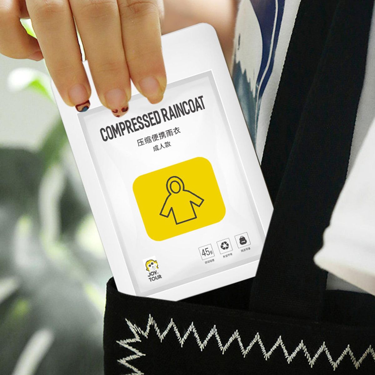 There are two sizes for you to choose from. Using compression package, this disposable raincoat is easy to be carried with you.