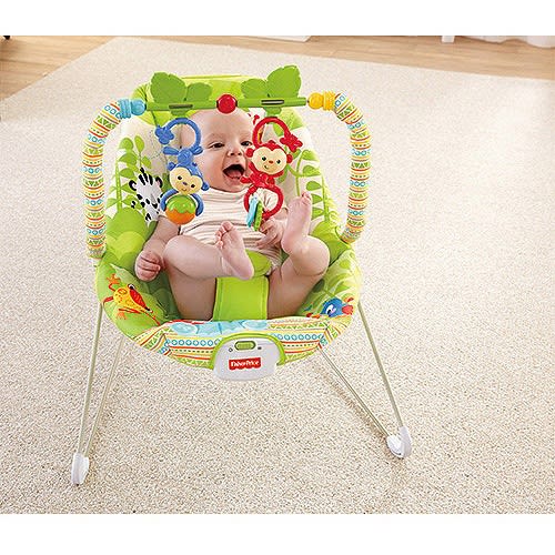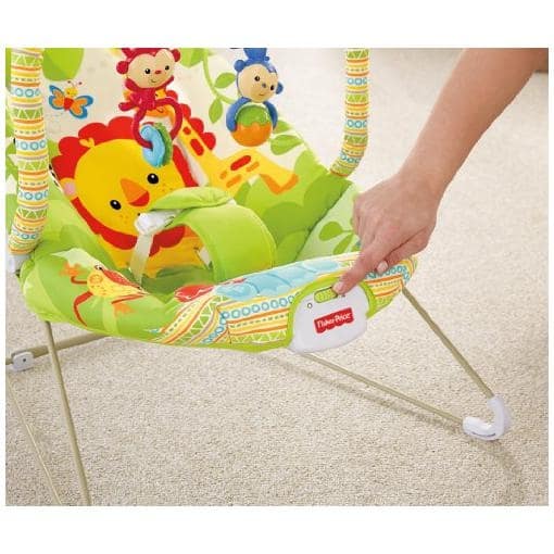 This Fisher-Price Rainforest Bouncer features loads of play. The soft, removable toybar features spinning leaves with bat-at, Take-Along Monkeys. The Take-Along Monkeys have clacker beads and a roller-ball and can be removed for baby to play with or transferred to other platforms in the Rainforest Friends line. For soothing, the Fisher-Price Rainforest Bouncer includes calming vibrations. Also features a three-point fabric restraint, machine-washable pad and non-skid feet. Fisher-Price Rainforest Friends Bouncer: The Friends Rainforest Baby Bouncer is recommended for babies up to 11.5kg. Use only for a child who is able to hold head upright unassisted and who is not able to walk or climb out of product. Features calming vibrations to soothe baby. 3-point fabric restraint. The Baby Bouncer includes soft, removable toybar that features spinning leaves for baby to bat at Also includes .Take-Along Monkeys with clacker beads and roller-ball. Part of the Rainforest Friends collection. Removable and machine-washable seat pad. The Fisher-Price Baby Bouncer requires 1 D battery (not included). Assembly required.