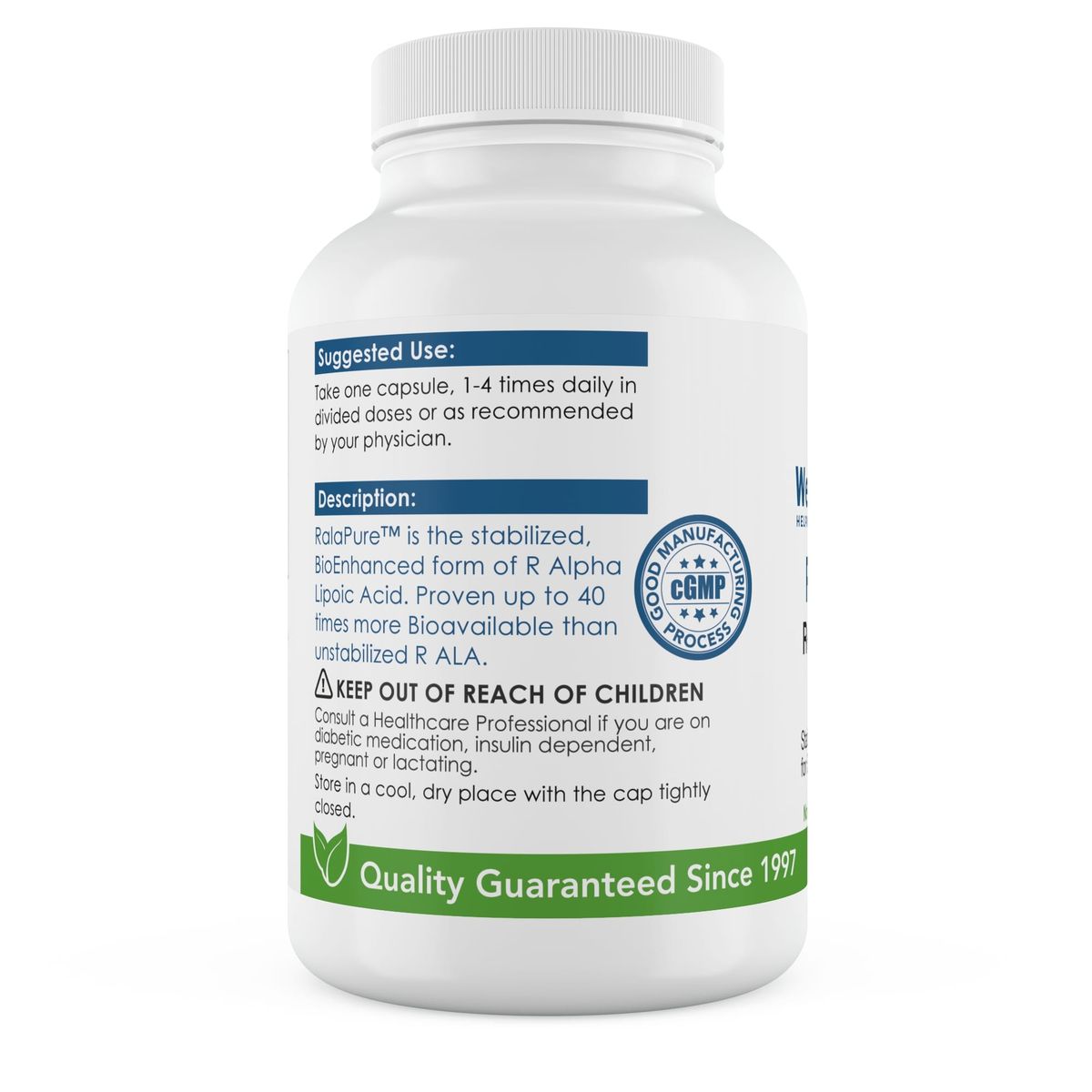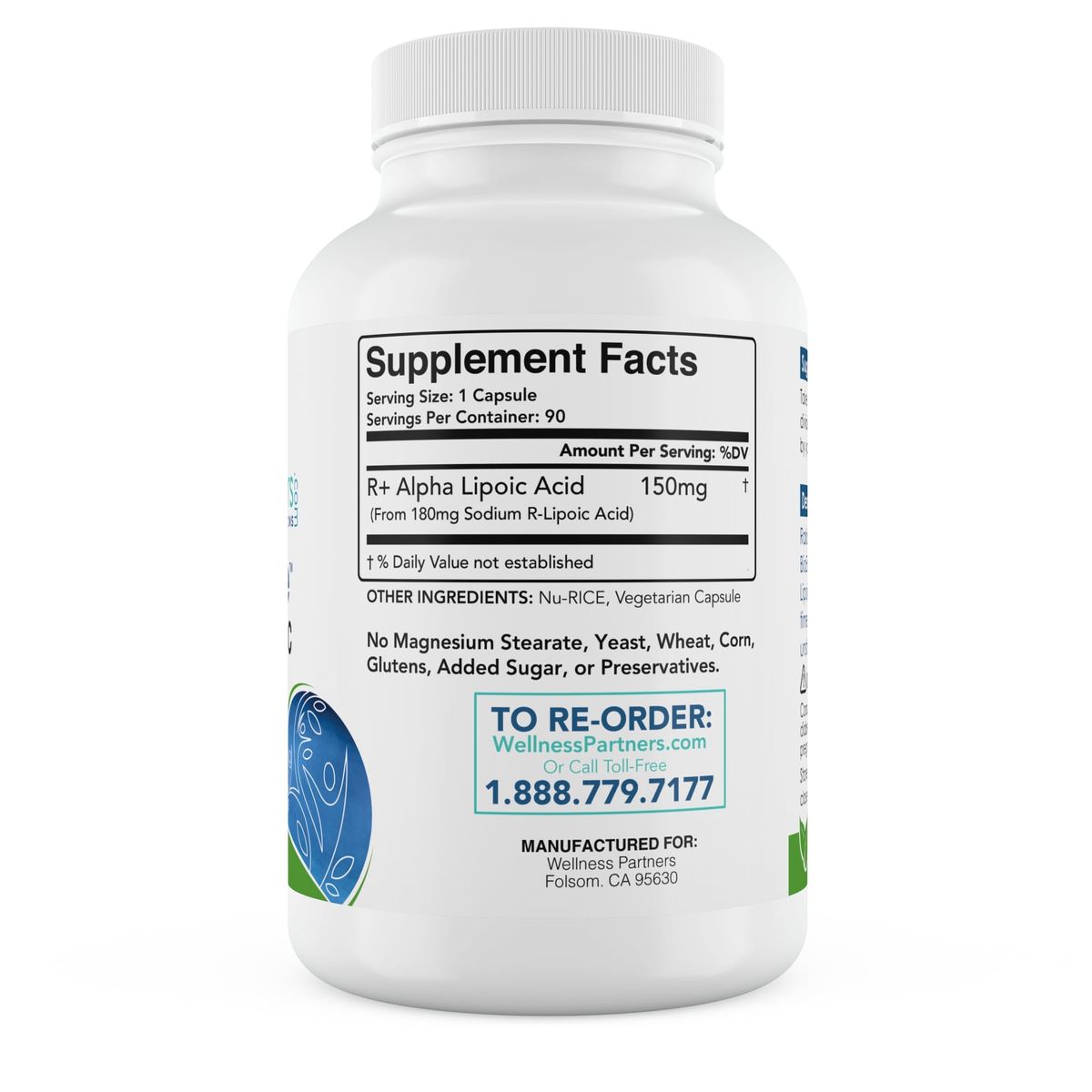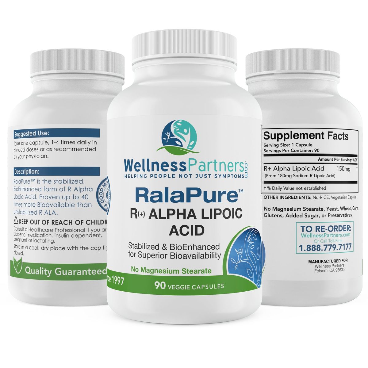If you buy another brand and it doesn't state "R+ Alpha Lipoic Acid (R-ALA)," it's not the natural form your body requires. RalaPure R+ Alpha Lipoic Acid (R-ALA) is the antioxidant you desire. We only stock R+ Alpha Lipoic Acid (R-ALA), so you know you're getting the real deal when you order from WellnessPartners.com™. Plus, our product is free of artificial colors, artificial sweeteners, artificial flavors, wheat, gluten, maize, yeast, soy, eggs, and dairy products.