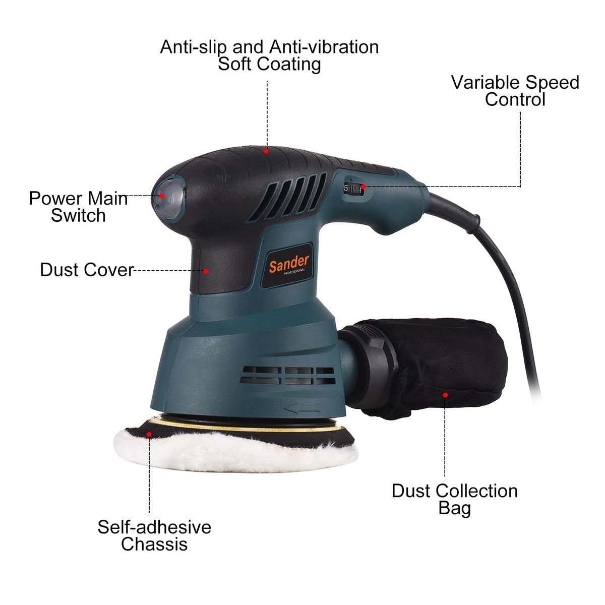 [Powerful Motor & 6 Variable Speeds]: The random orbit sander has a 2.5-amp 300W motor with 5000 to 13000 OPM. The 6 variable speeds applied on this orbital sander is to fulfill multiple personal needs. The electric wood sander is ideal for various scenarios and purposes, such as sanding, removing paint, smoothing out wood, varnishing, polishing and so forth. The powerful motor and adjustable speed mode can improve efficiency and effectiveness well on your works!
