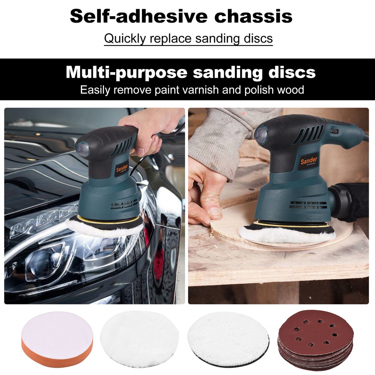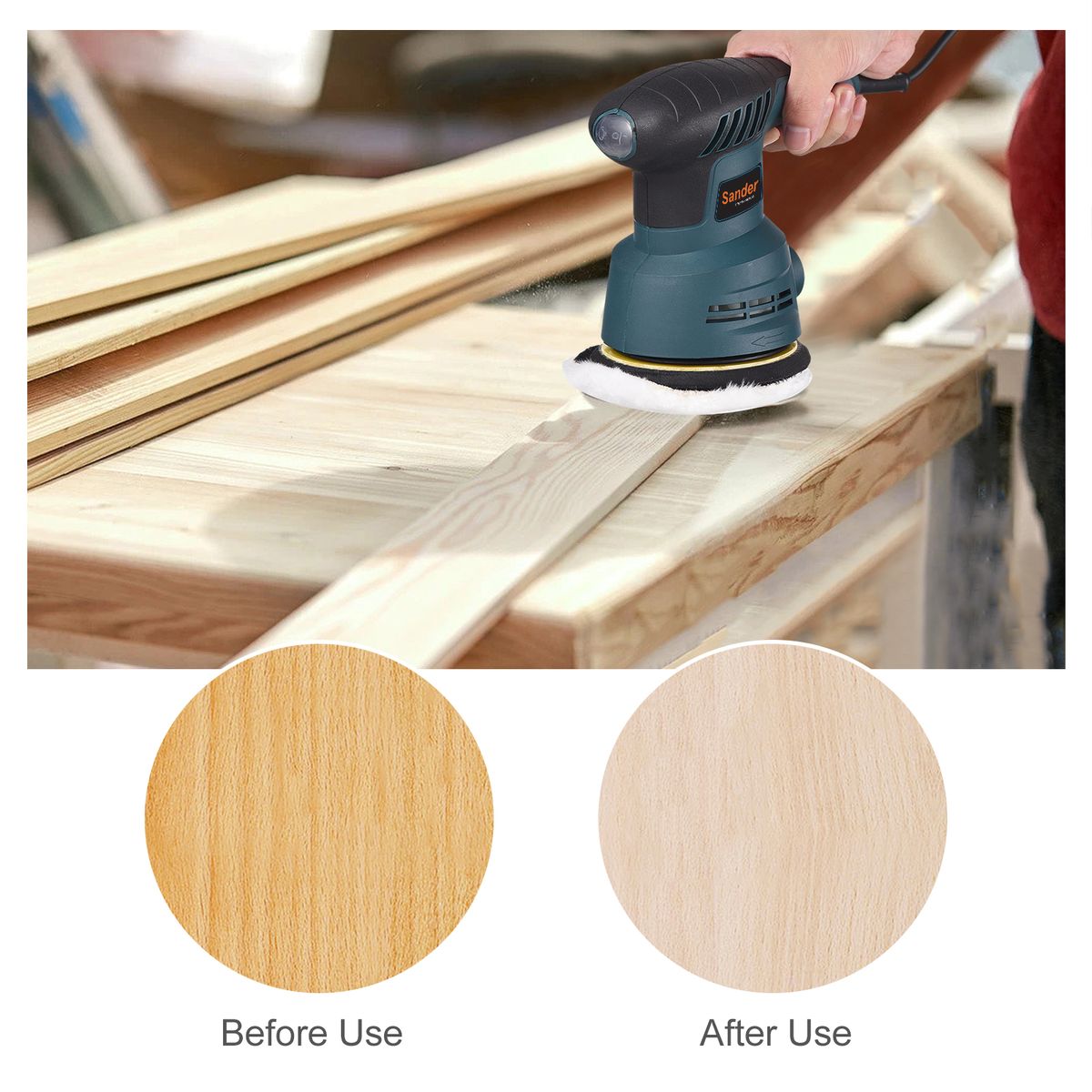 Features:[Sanding Disc x 20 & Polishing Pad x 3]: The random orbit sander has a set of versatile and valuable accessories for wide ranges of applications, including sandpapers x 20 (60 grit x 4, 80 grit x 4, 120 grit x 4, 180 grit x 4, 220 grit x 4), sponge disc x 1, wool disc x 1 and cotton disc x 1, in order to meet various personal needs. The Hook & Loop disc design on the random orbit sander is ideal for replacement of sandpapers and discs to improve efficiency and make replacement more convenient. After polishing, you can directly replace the polishing pad for surface polishing to make the wood more smooth and shiny.