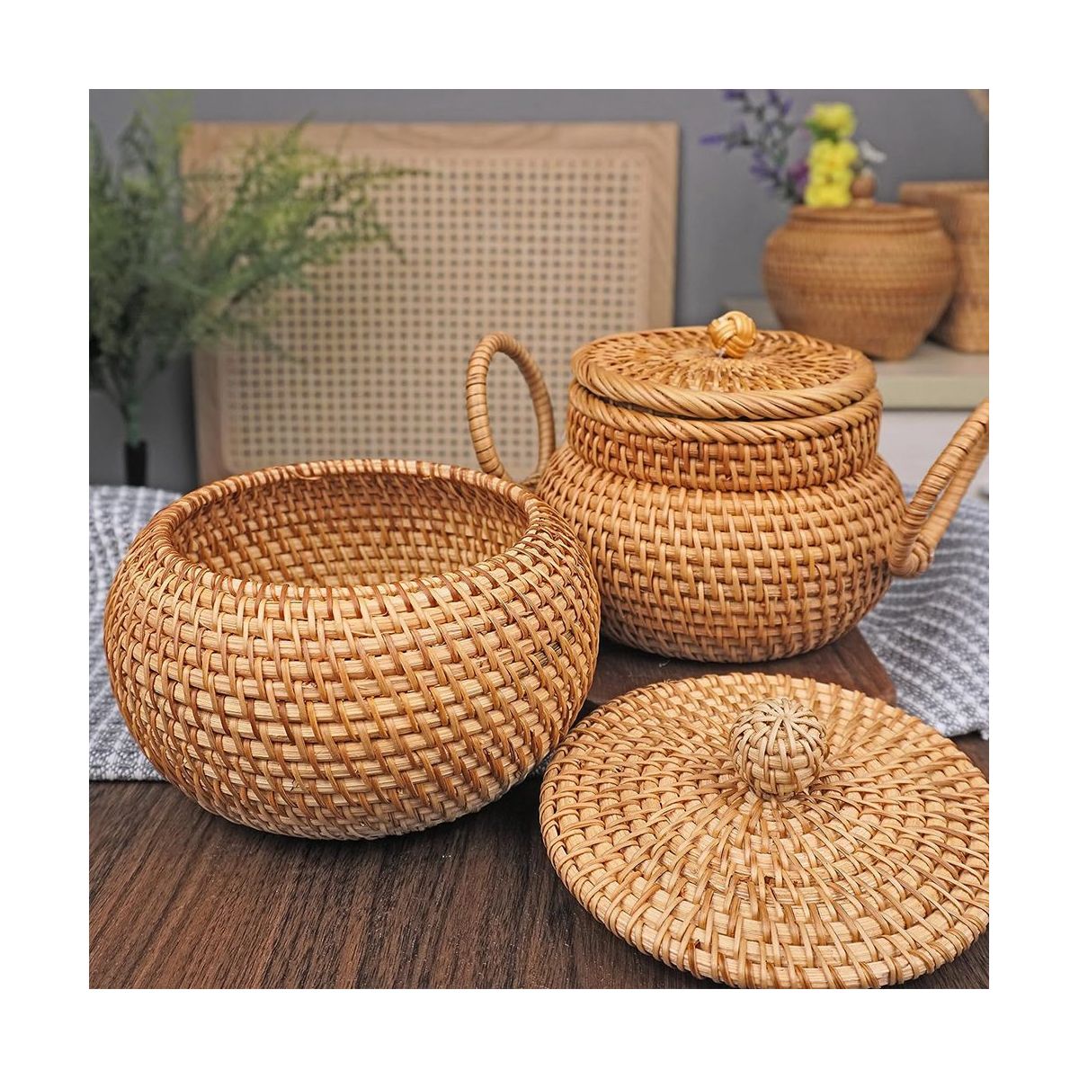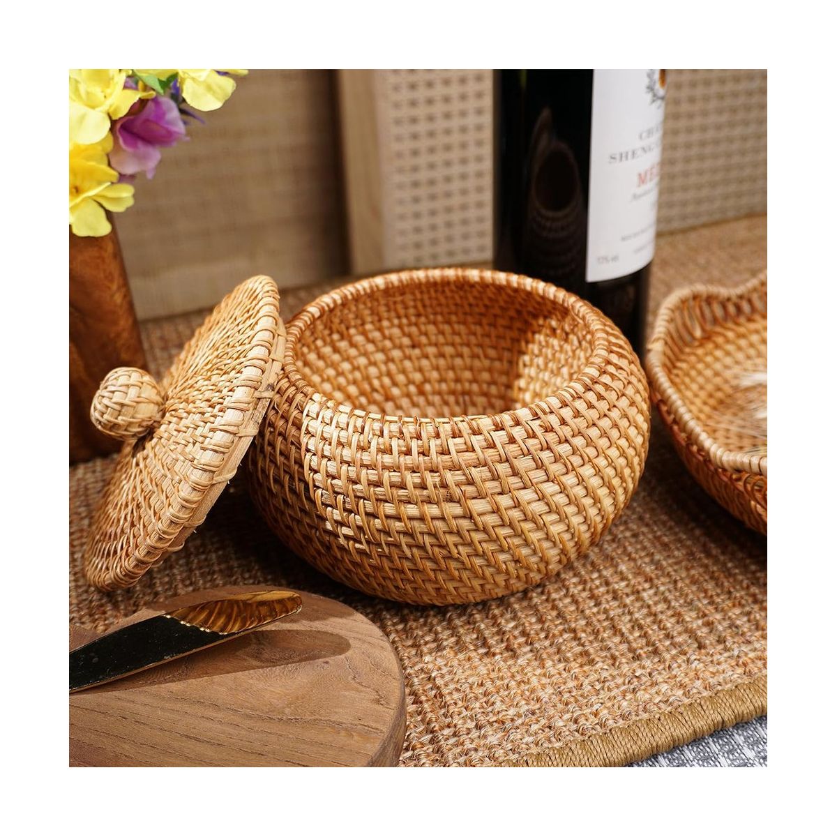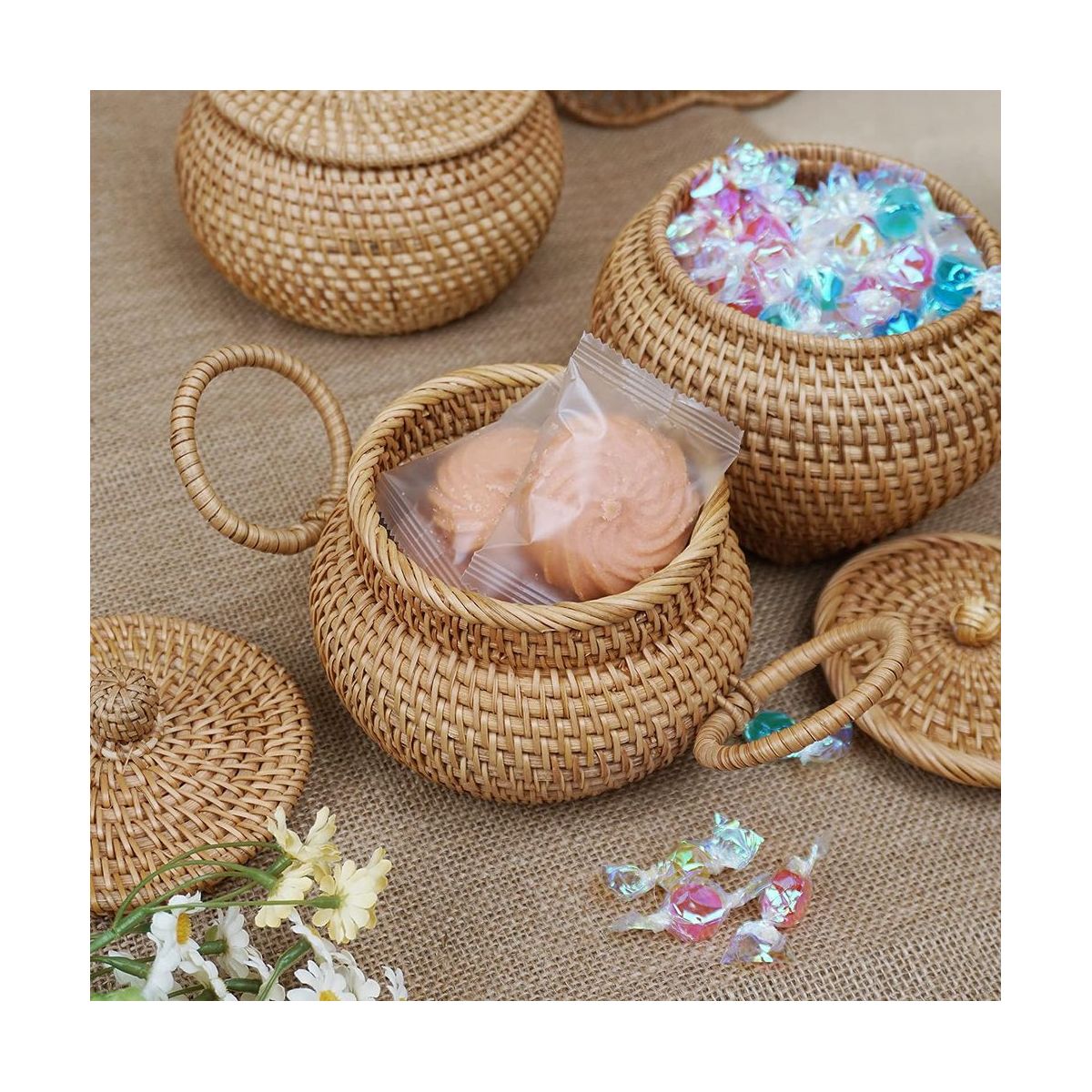 Multipurpose: The rattan basket with lid can be used both indoors and outdoors. You can use it in living room, bedroom, console table, kitchen, office to organize your small items. A perfect little basket, you can take it to camping, picnic, afternoon tea to store tea bags, coffee bags, biscuits, chocolates and more.