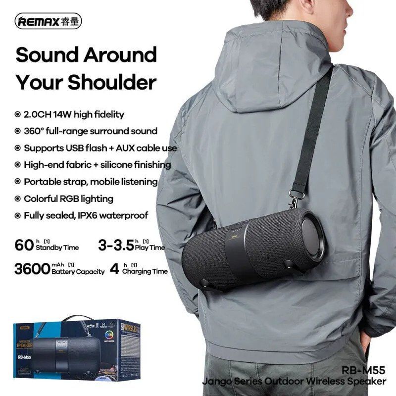 REMAX RB-M55 Bluetooth Wireless Portable Speaker is compatible with any smartphone. Bluetooth speaker comes with a lanyard for portability. There are RGB lights to add beauty. The material is ABS plastic, thick and strong. Covered with fabric able to connect two speakers at the same time, True wireless stereo. With a built-in mic, can receive voice calls through the speaker. There is a light to show the working situation and show the battery percentage output.