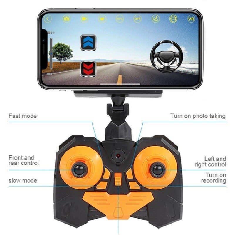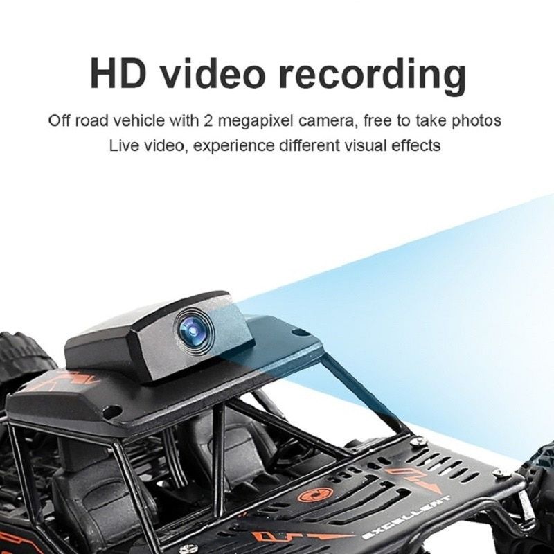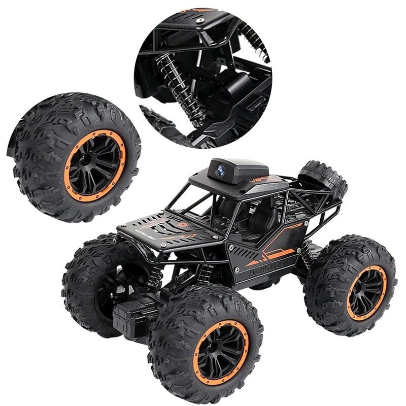 RC Car 2.4G 720P WIFI FPV HD Camera High-speed Off-road Climbing Double Steering Buggy Rock Crawler 4wd Rc Vehicles Kids Toys Features: * REMOTE CONTROL CAR equipped with a HD camera, which allows you to make live videos during driving via your phone. Take High-resolution photos and videos. * 2 WAYS CONTROL: You can drive this car in two modes. FIRST Mobile App driving via Wi-Fi you can follow a car via a phone screen, build a track, share live stream videos and saved pictures with friends or even with the whole world. SECOND 2.4Ghz remote control (Require 2xAA battery,not included) * Superior Control Experience: The 2.4GHz controller not only controls Forward/Reverse and Right/Left movement, but it also allows you to turn the camera on or off. Low speed smooth, high-speed throttle response, sensitive steering and speed, anti-skid high-performance rubber tire easy to face the challenges of various terrain. * STRONG SHOCK ABSORBERS: This car has advanced anti-skid rubber tires, shock absorbers and anti-collision beam, sensitive steering which give support to unexpected dropping and the unstable surface of the ground. Specifications: Color: Black Ratio: 1:18 Remote Frequency: 2.4 GHz Remote Control Battery: 2 * AA Batteries (Not Included) Car Body Battery: 3.7V 500mAh Lithium Battery(Built-in) Charging Time: About 2 Hours Materials: Eco-friendly ABS + Electronic Components Car Size: About 20.5x14x12.5cm/8.07x5.51x4.92 inch Package Listing: 1x Remote Control Car With Camera(built-in rechargeable battery) 1x Adjustable Phone Holder 1x Remote Control 1x USB Charging Cable 1x Screwdriver Notes: 1. Please allow slight dimension difference due to manual measurement. 2. Please consider the actual sizes in the listing as the pictures are generally enlarged to show detail. 3. Due to the light and screen difference, the item's color may be slightly different from the pictures. If you minding the difference, please buy it carefully.Thanks for your understanding.