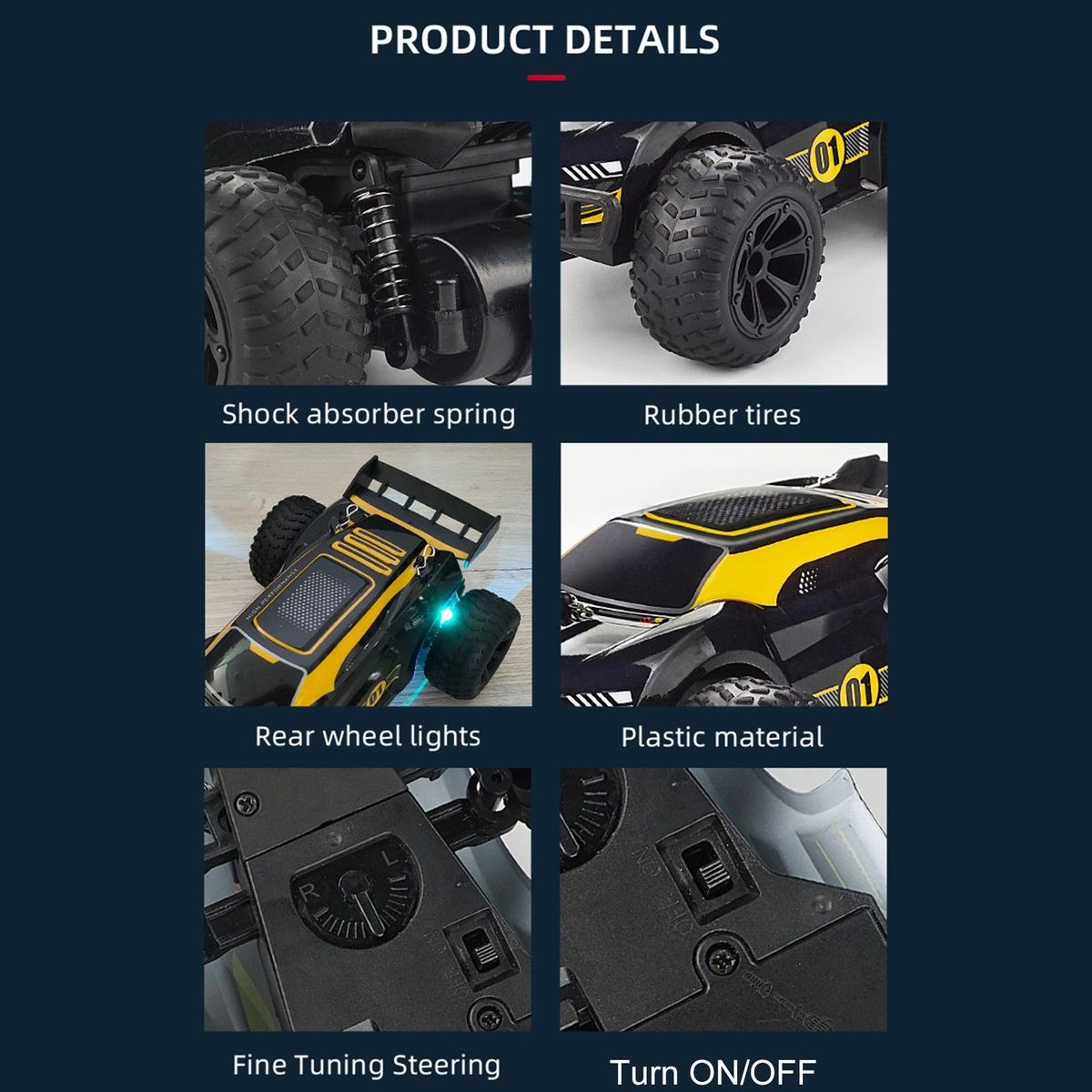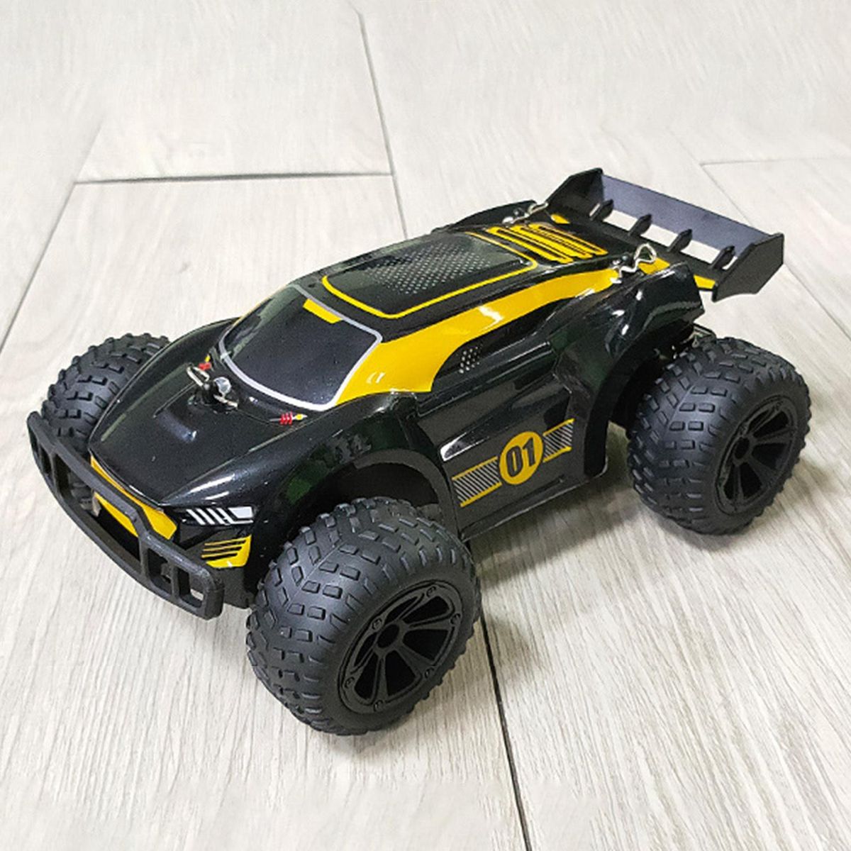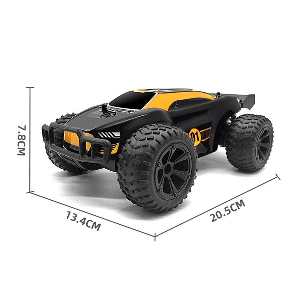 off-road racing car, large tires with bump pattern, cool lighting, anti-skid shock absorption. Good climbing performance and crash worthiness enable it to climb complex road conditions, and the remote control operation is more realistic.