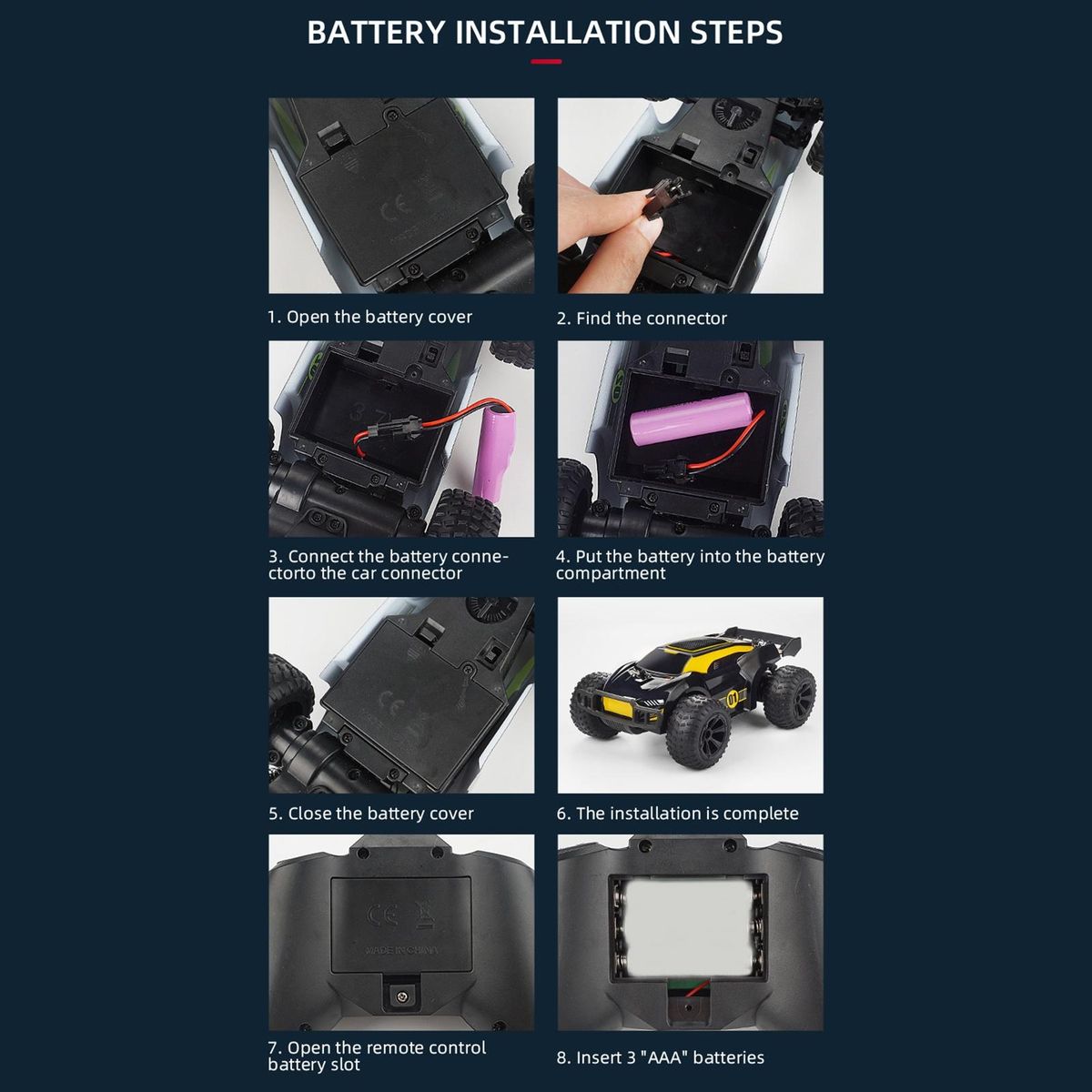 Power Supply: Car, 3.7V-500mAh (Included); Remote Control, 3 x AAA Batteries (Not Included)