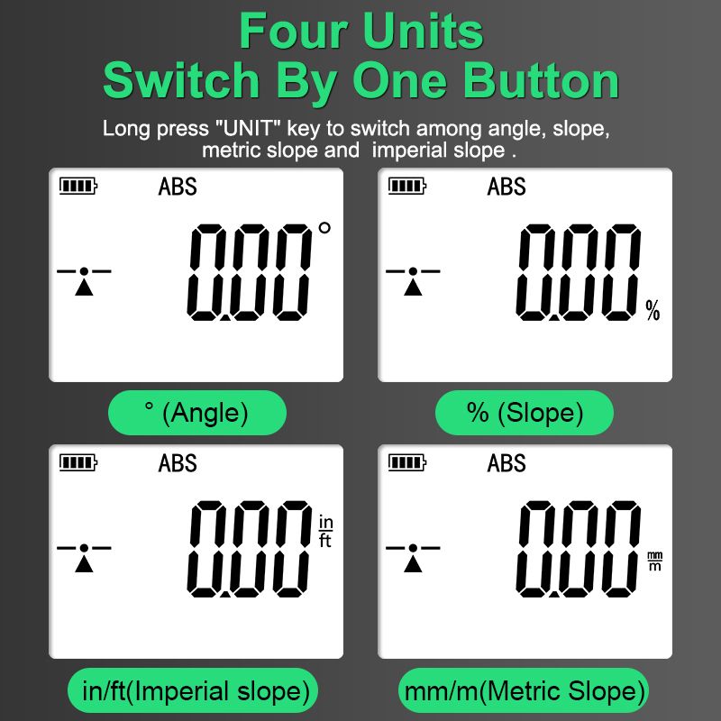 Clear illuminated LCD display with automatic backlight Magnetic base Simple operation by just 3 ons Absolute & relative measurement Zero set to any position to find the relative angle between 2 planes See-figure on the display to show the tilted direction No Temperature drift Auto power off function Aluminum framework Handy easy to carry anywhere Pre-calibrated at the factory