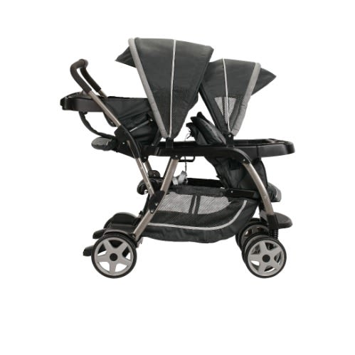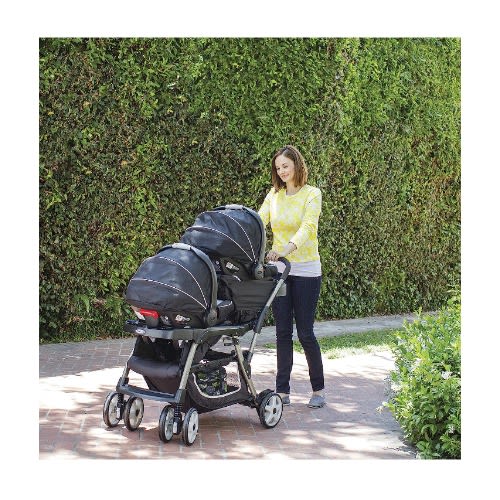 Comfy adventures for two, plus you. The Duo Glider Click Connect Double Stroller has all the essentials a growing family needs. This lightweight double stroller features stadium-style seating, so the child sitting in the rear is slightly raised for a better view. To keep both passengers nice and comfy, both seats feature a reclining seat, child's tray, rotating canopy and footrest. And for Mom, a one-hand fold, extra large storage basket, and parent's tray. The Duo Glider tandem stroller accepts two Graco infant car seats, too. Care and Maintenance: Wash removable seat cushion in cold water on delicate cycle and line dry. To clean stroller frame, use only household soap and warm water. Never use bleach. If wheels squeak, use a light oil. Each seat holds child up to 40 lbs