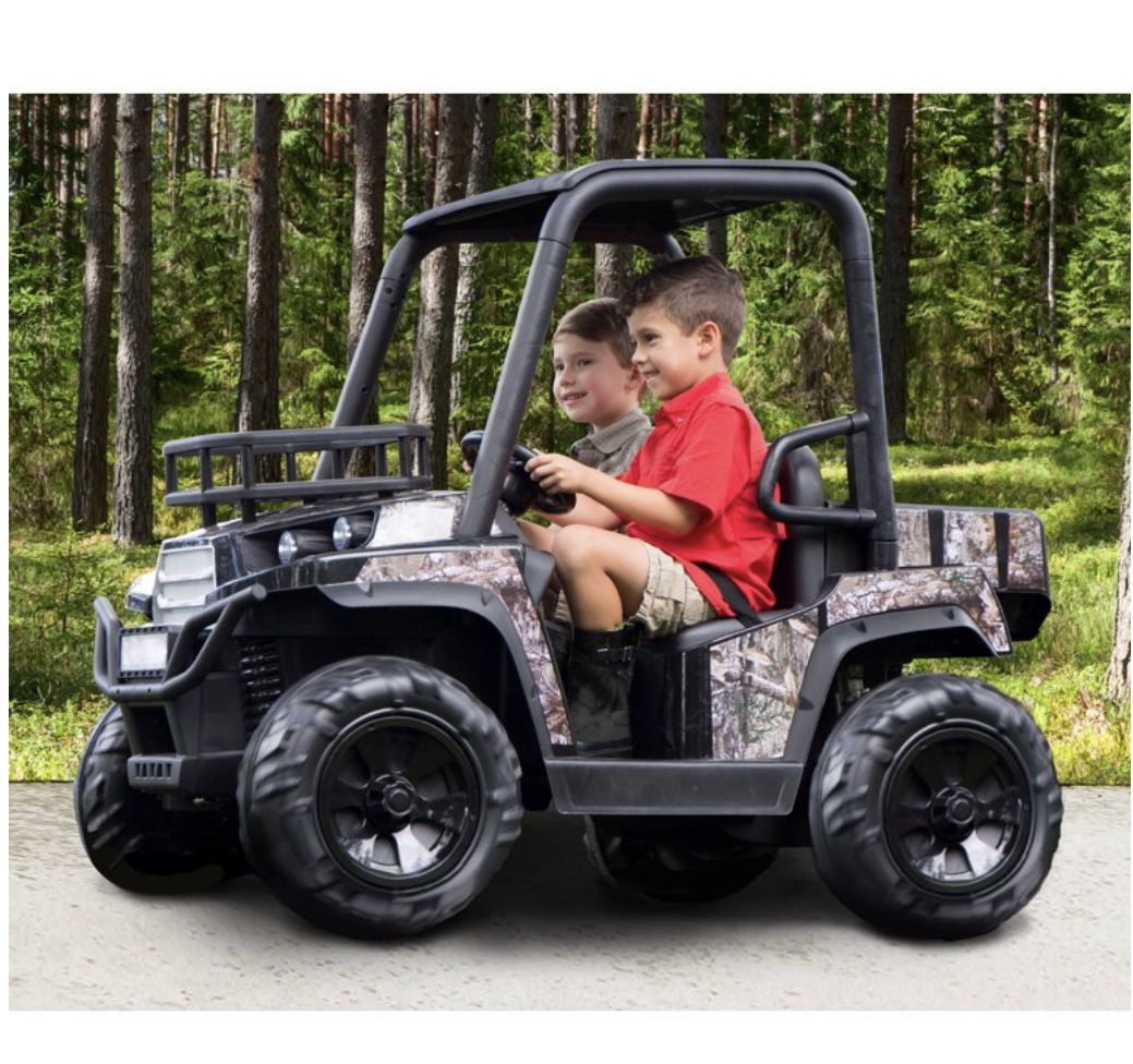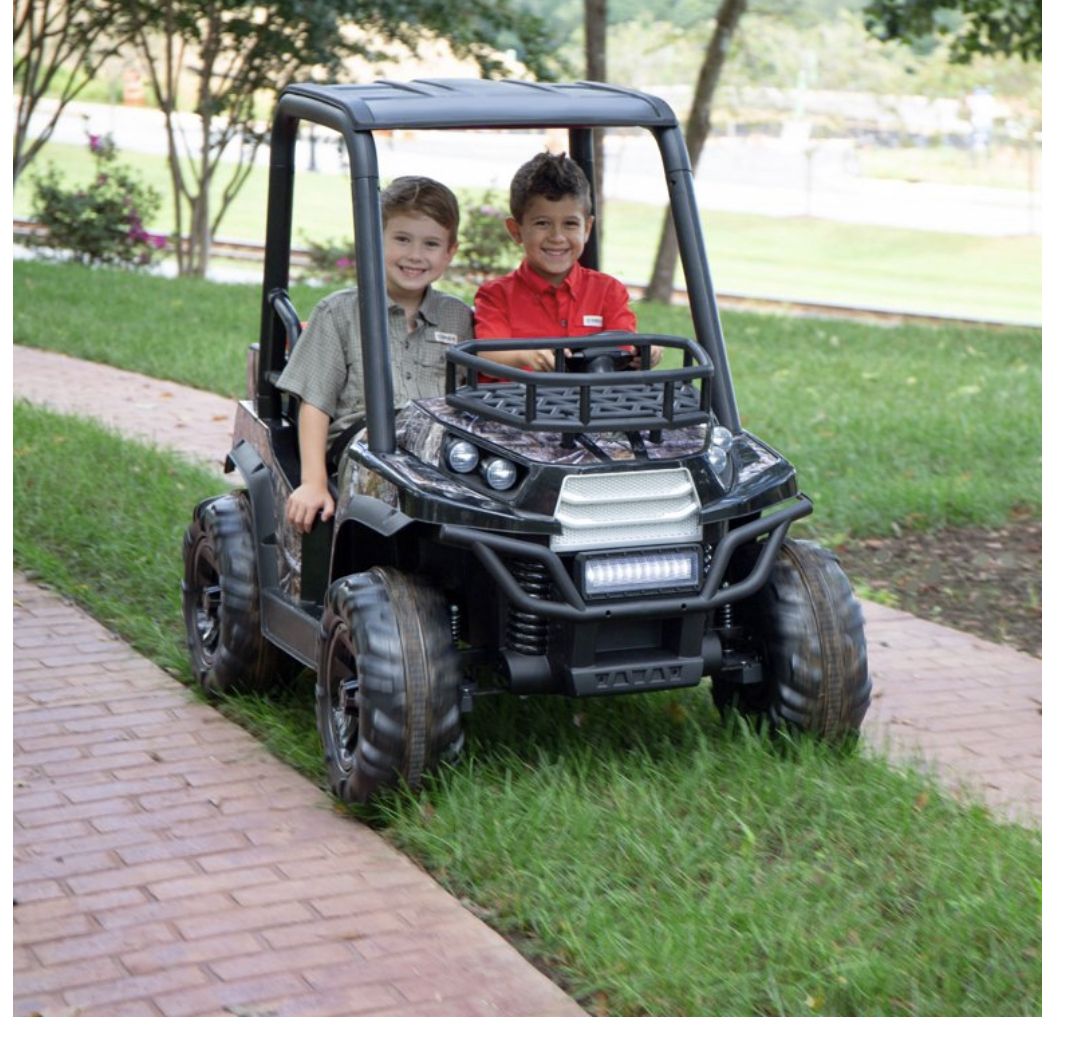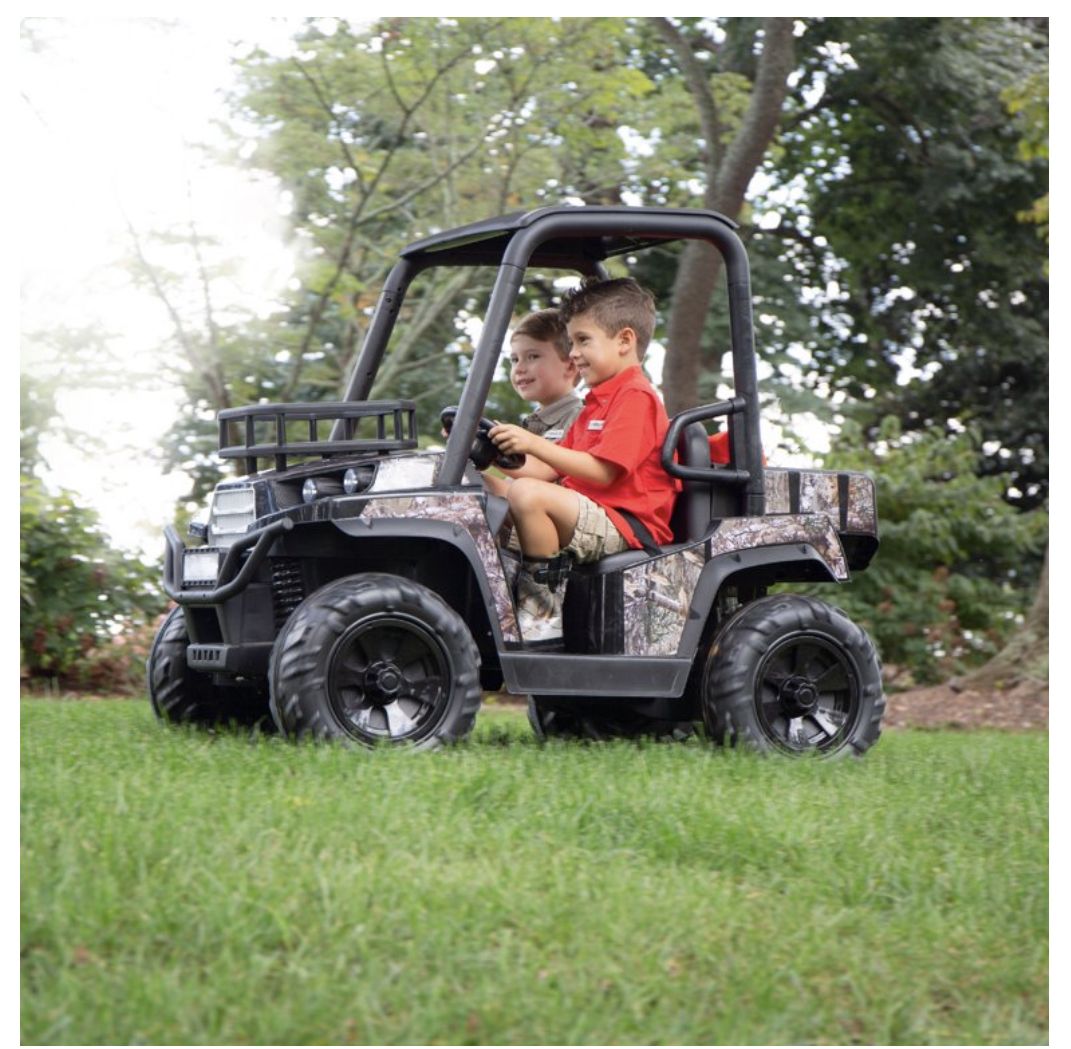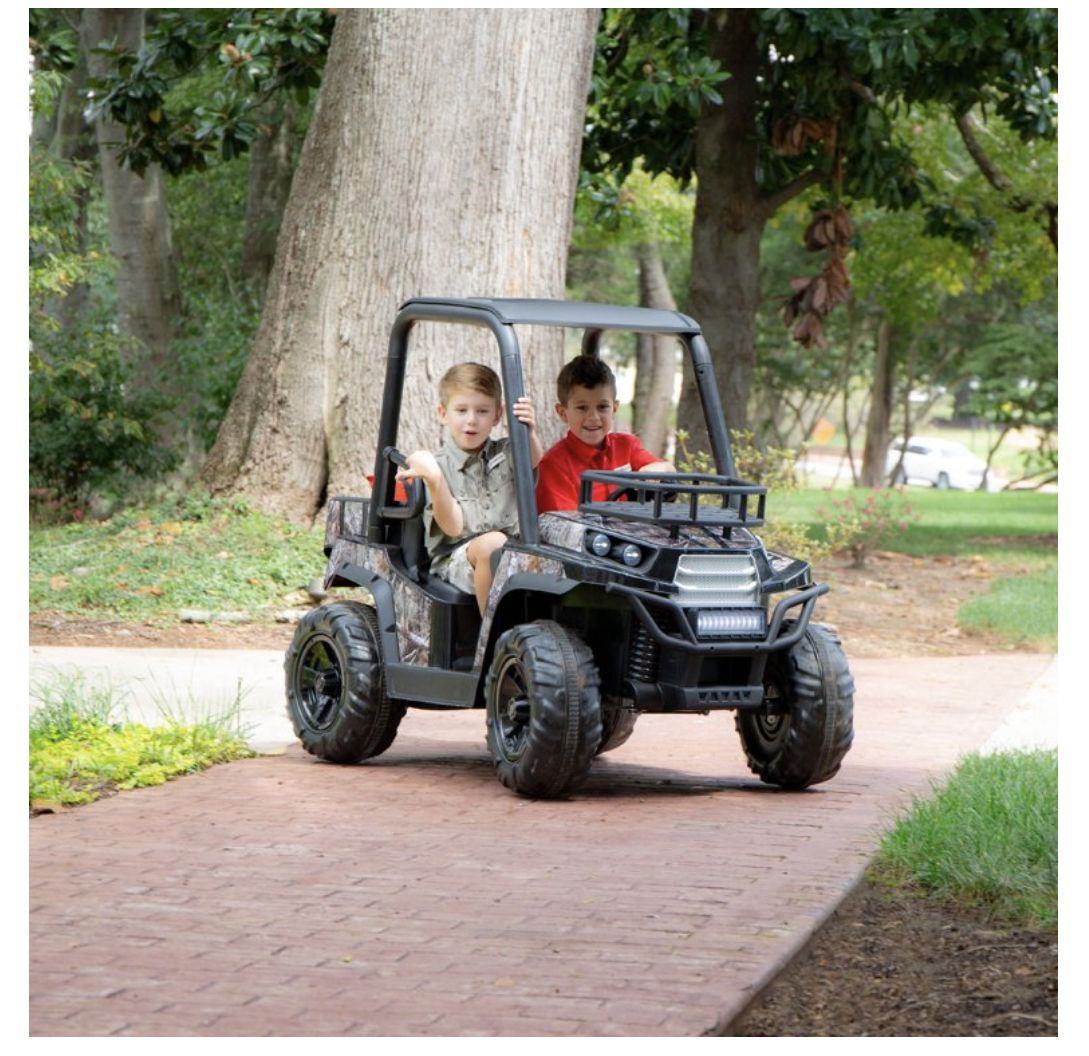 The 24V Realtree UTV is the rugged set of wheels that your young outdoor enthusiasts needs! This powerful ride is decked out in custom Realtree graphics and includes working front headlights. Riders can use the front rack and rear cargo storage compartment to haul and store materials needed for their adventure! Your little camp lover is going to love riding the 24V Realtree UTV during their outdoor adventures!Front Rack, Suspension spring, Working Headlights, MP3 Input, Realistic UTV Sounds