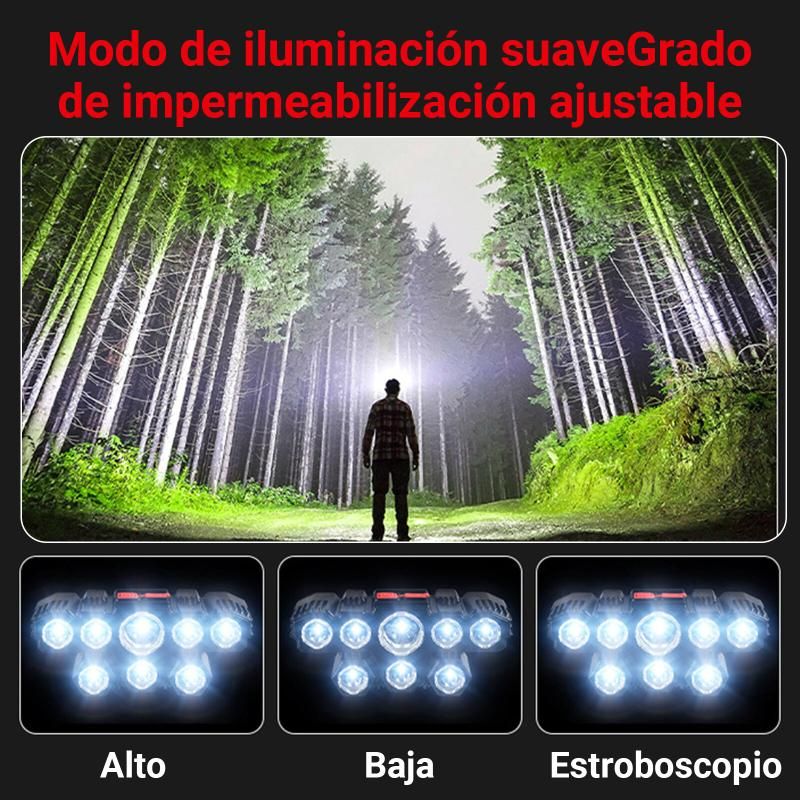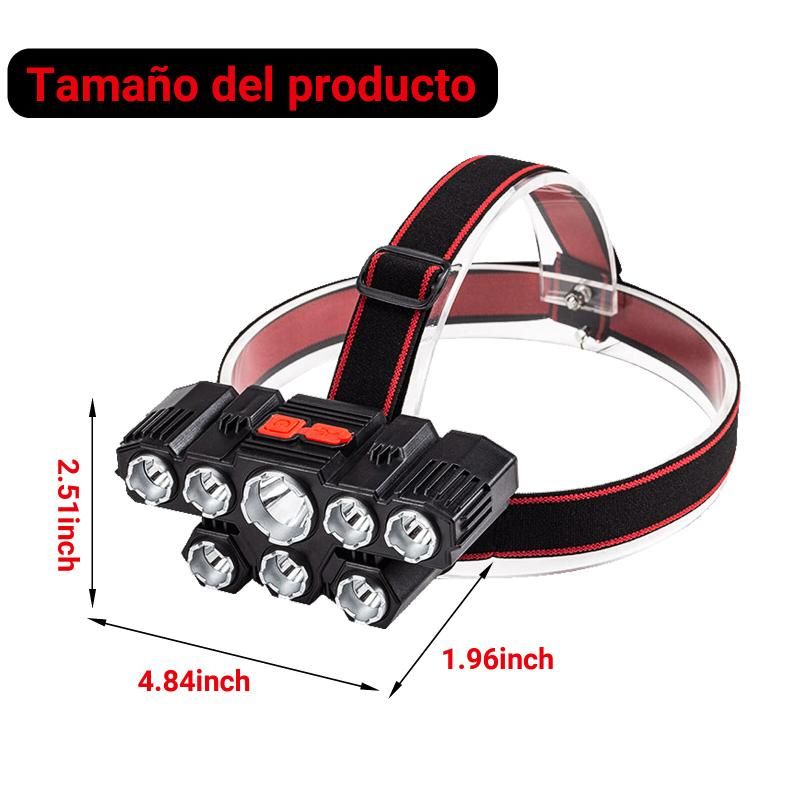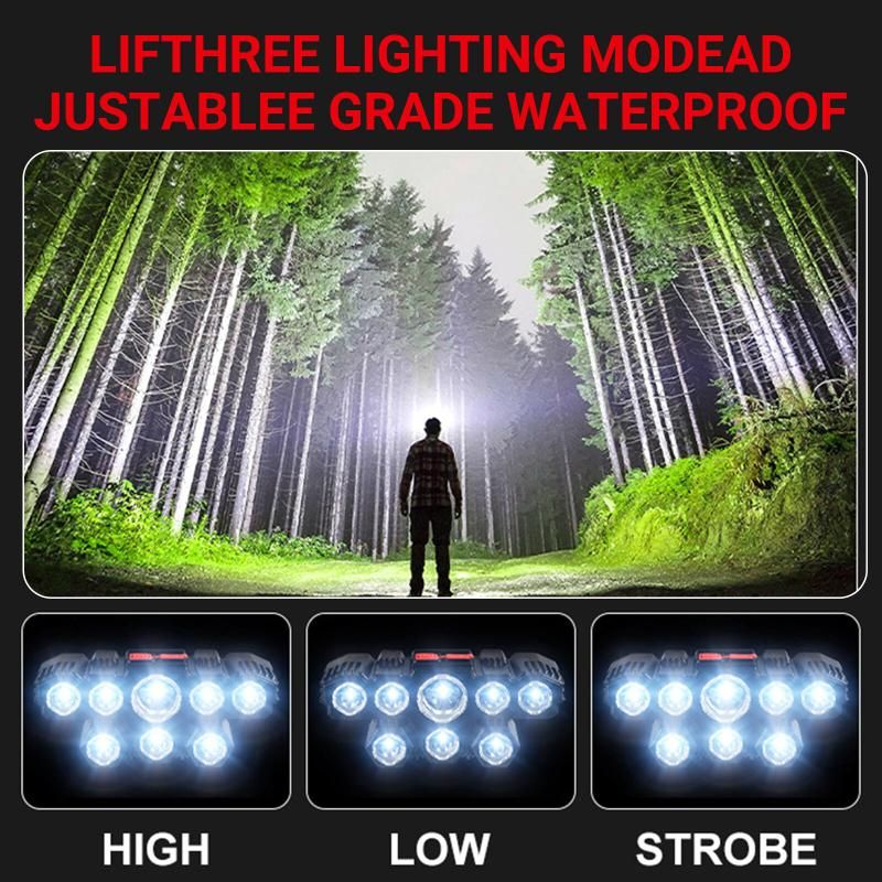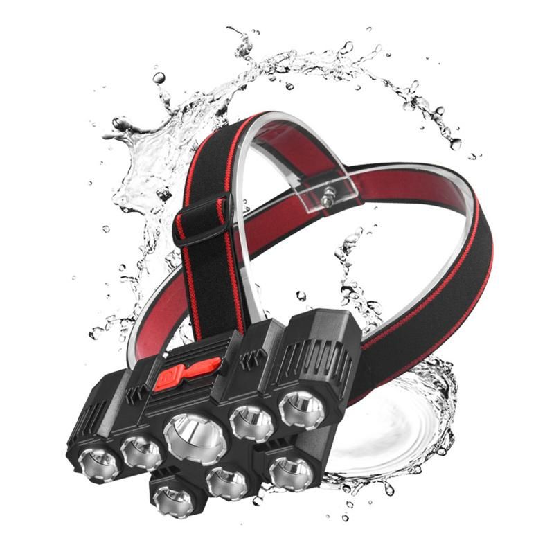 This waterproof headlamp is very suitable for fishing, hunting,night racing, hiking, camping, car repair, emergency rescue, and other outdoor and indoor activities. The headlamp consists of 8 LED bulbs and is powered by rechargeable batteries which can provide a stronger bright.