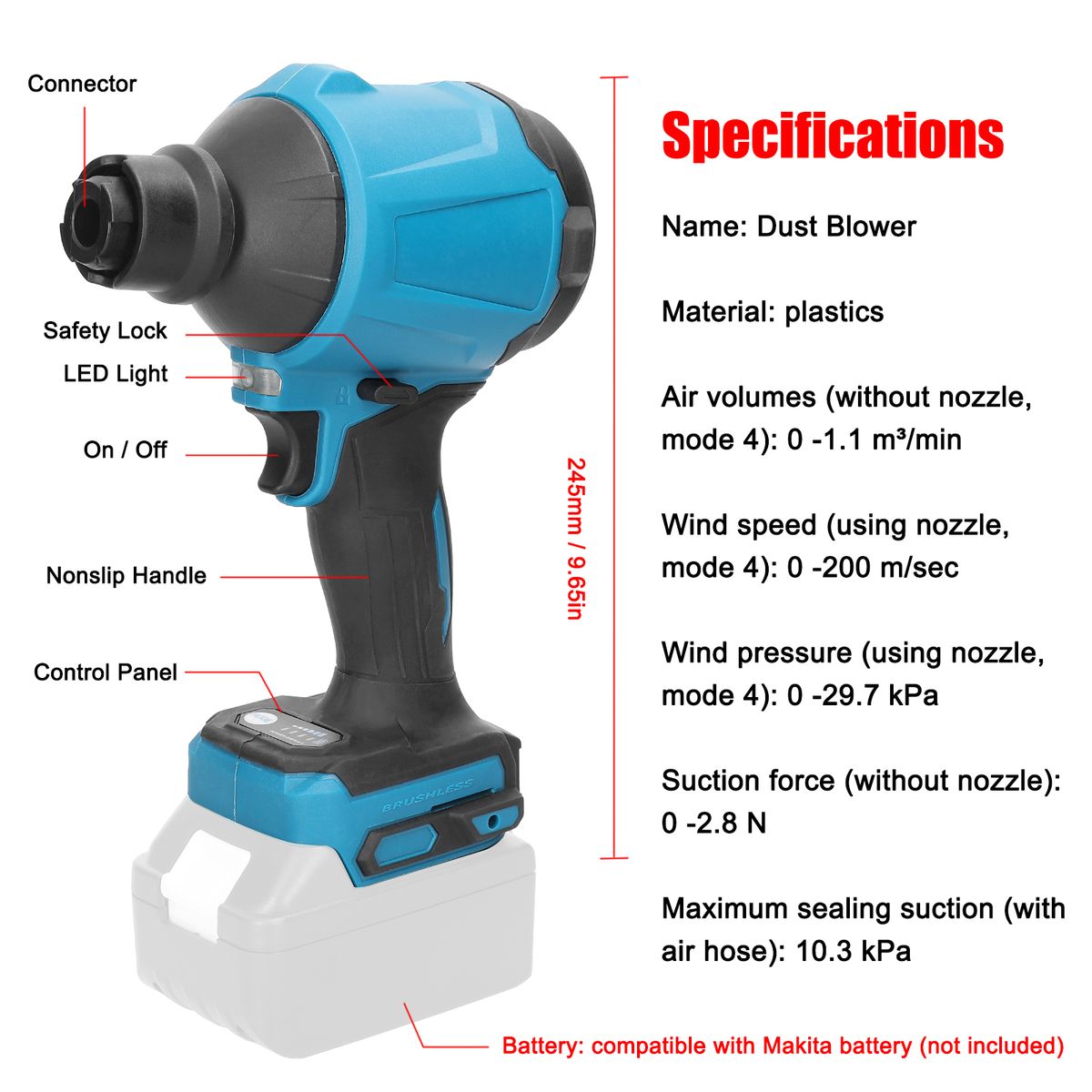 This lithium air dust blower uses a nice quality pure copper core motor to provide strong suction and wind , with air velocities up to 200m/s. With 29.7 kPa maximum air pressure, and 10.3 KPA maximum sealing suction pressure (using a sealing hose). With four output airflow modes design, you can adjust the wind to your needs. Wide applications, suitable for cleaning workshops and removing dust from pilot holes or inflated pool toys.