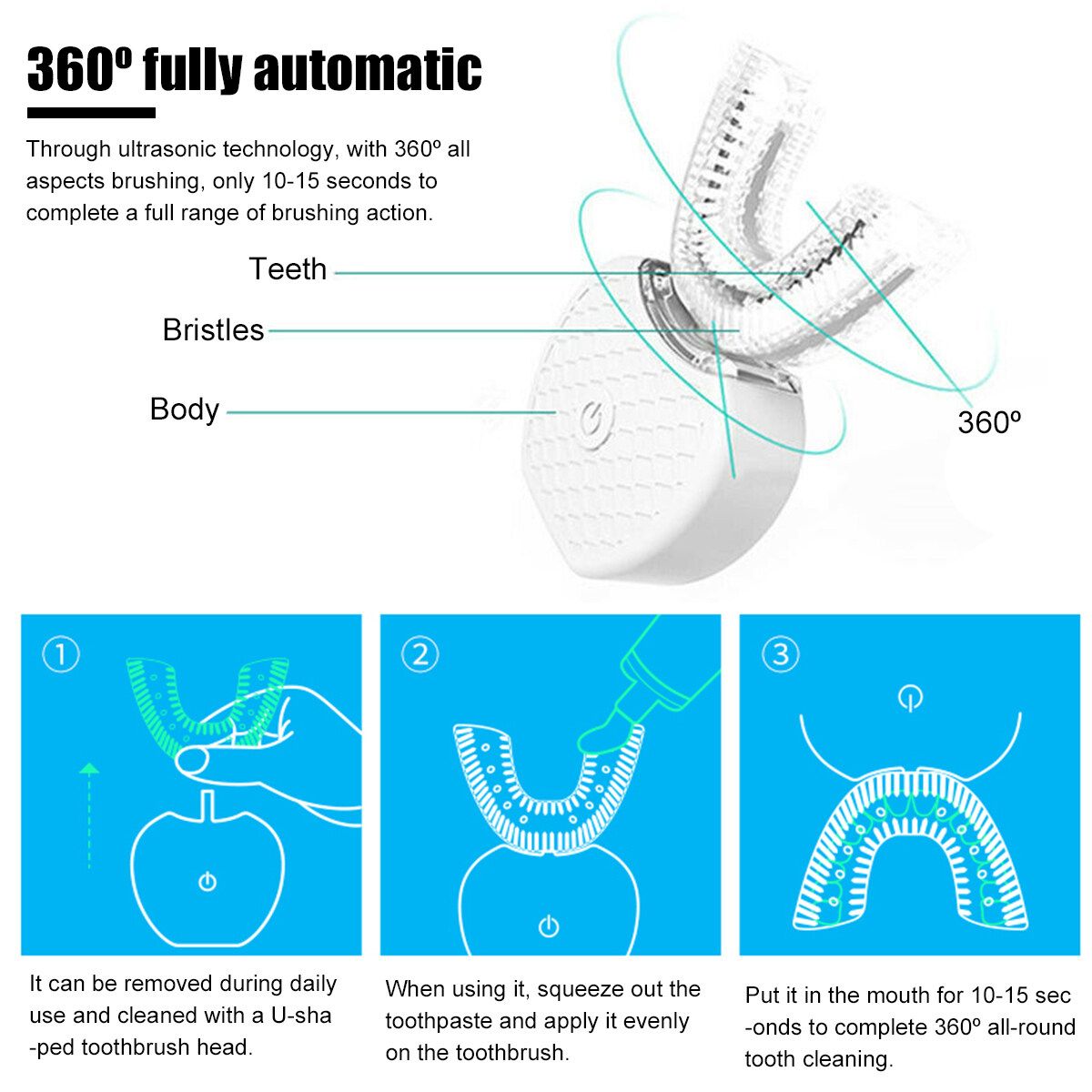 3. Automatic making foam, teeth cleaning, u-shaped silicone toothbrush head, without using yourself hands.