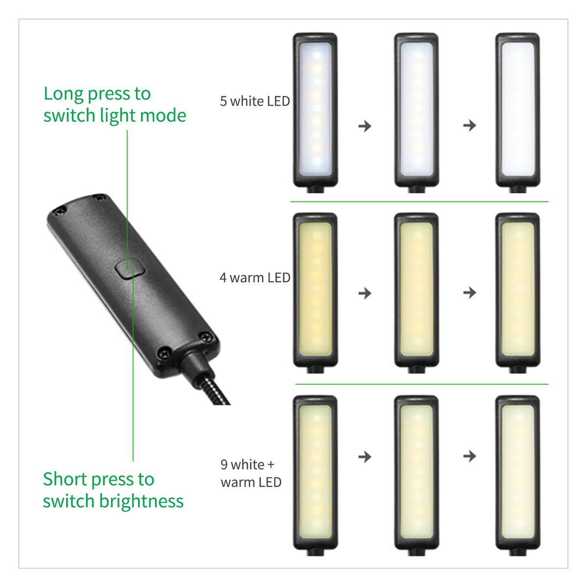 Number of Light Beads: 5 white LEDs and 4 warm LEDs