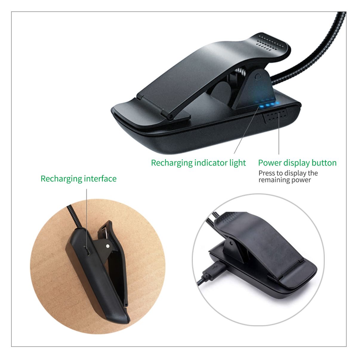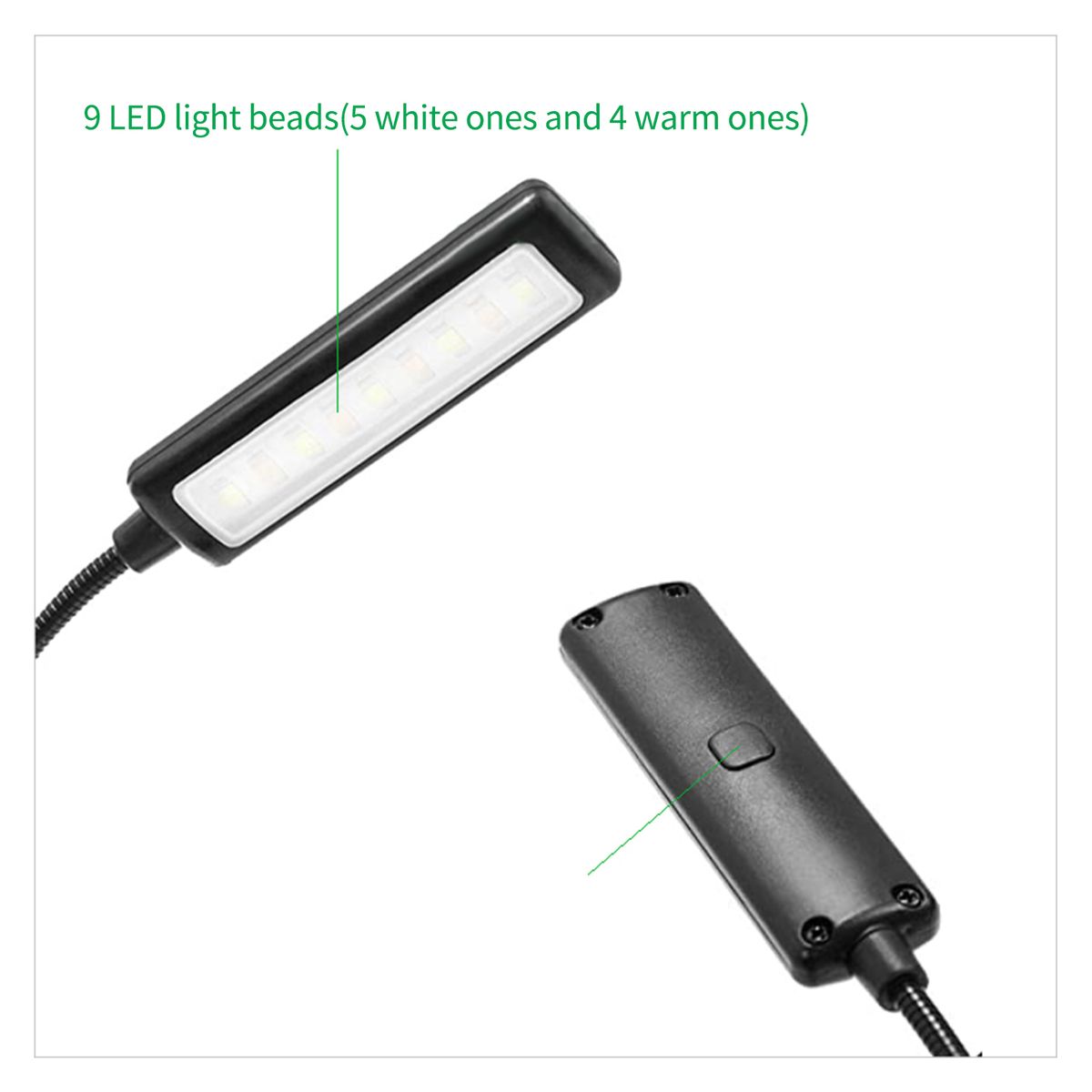 Enough Lighting Area - With electricity quantity display,the book light has 5 white LEDs and 4 warm LEDs for illuminating enough area when you are reading or working.