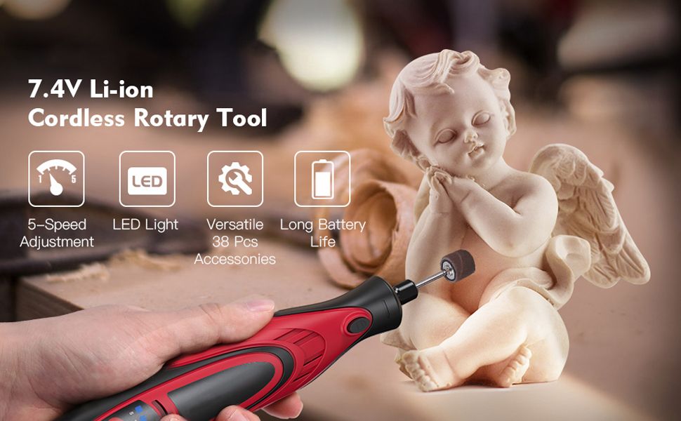 【Rechargeable 7.4V Lithium Battery】: Rotary tool is equipped with 7.4V lithium-Ion battery power, which is high powerful. It ensures strong and steady power. Besides, 1100mAh capacity of the battery ensures longer runtime.