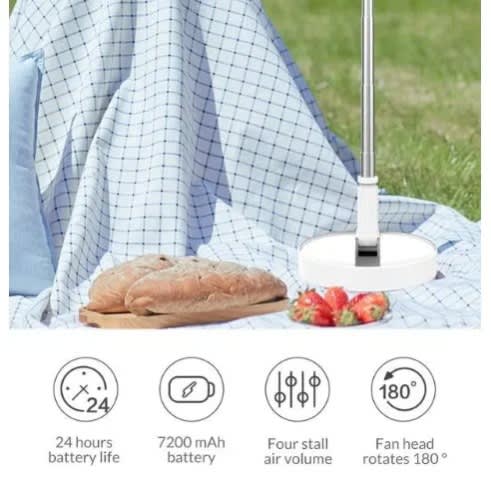 Night Light & Hanging Hook Design 3 Adjustable Speed Setting Mini Fan - Low, medium and high. At the bottom of the desk fan featured with a night light, which's perfect for camping, hiking or other outdoor activities. Back of the fan equipped with hanging hook, can be hanged inside the umbrella while walking.