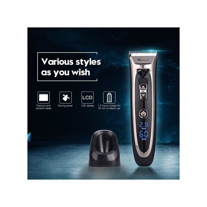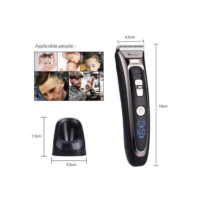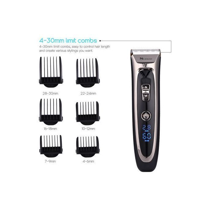 Feature:With digital LED display, which can intuitive show the fine tuning cutting length, the remaining battery level separately by the unit of millimeter and minute.Titanium and ceramic professional detachable b-lade, high precision and can be washable.Sharp b-lade and powerful motor, can trim your hair fast, no hair get stuck and no hurt to your skin.Low noise design, there is no ear-piercing sound, nor disturbing others during operation.Adjustable cutting length b-lade switch for fine tuning from 0.8mm-1.5mm-2.2mm-2.8mm, which can create different hair styles.7 comb attachments help you trim easier and more accurate.Built-in 600mAh Li-ion battery, fast charging, after 1.5 hours full charge, it can be used continuously for 60 minutes.Cord and cordless dual use, 100-240V dual voltage and easy to carry, can be used in travel.Perfect for men, also for kids, the elderly, professional barber, and etc. Note:International transport does not allow liquids, shipping does not contain lubricating oil.The body and the adapter are not waterproof, only the b-lade, the comb attachments can be removed and washed with water, be sure to let them dry before using again.
