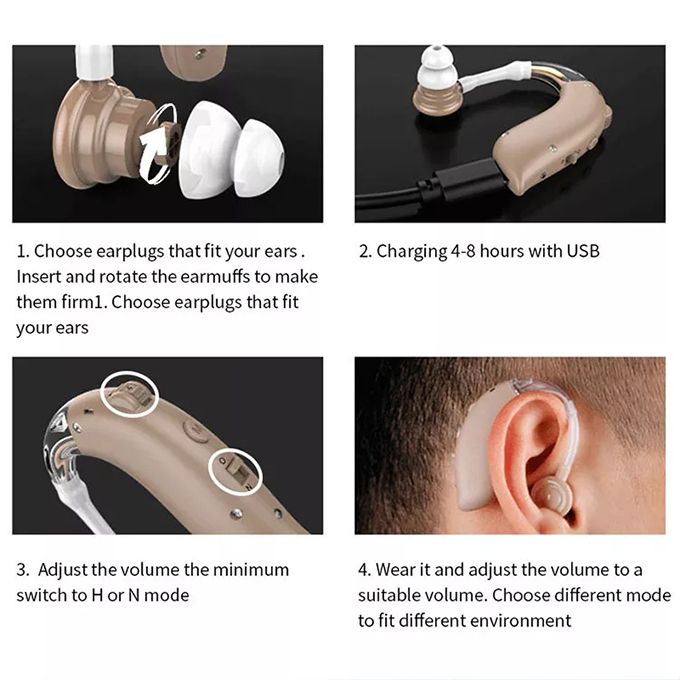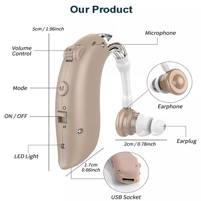 1 x Hearing aid4 x Earplug (different sizes)2 x User manual1 x Cleaning brush1 x Charger Head1 x Charging Cable
