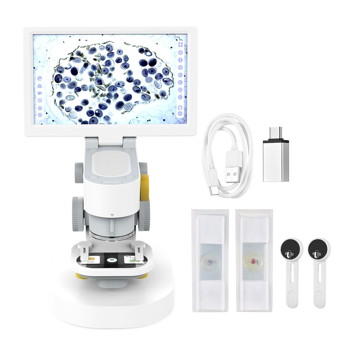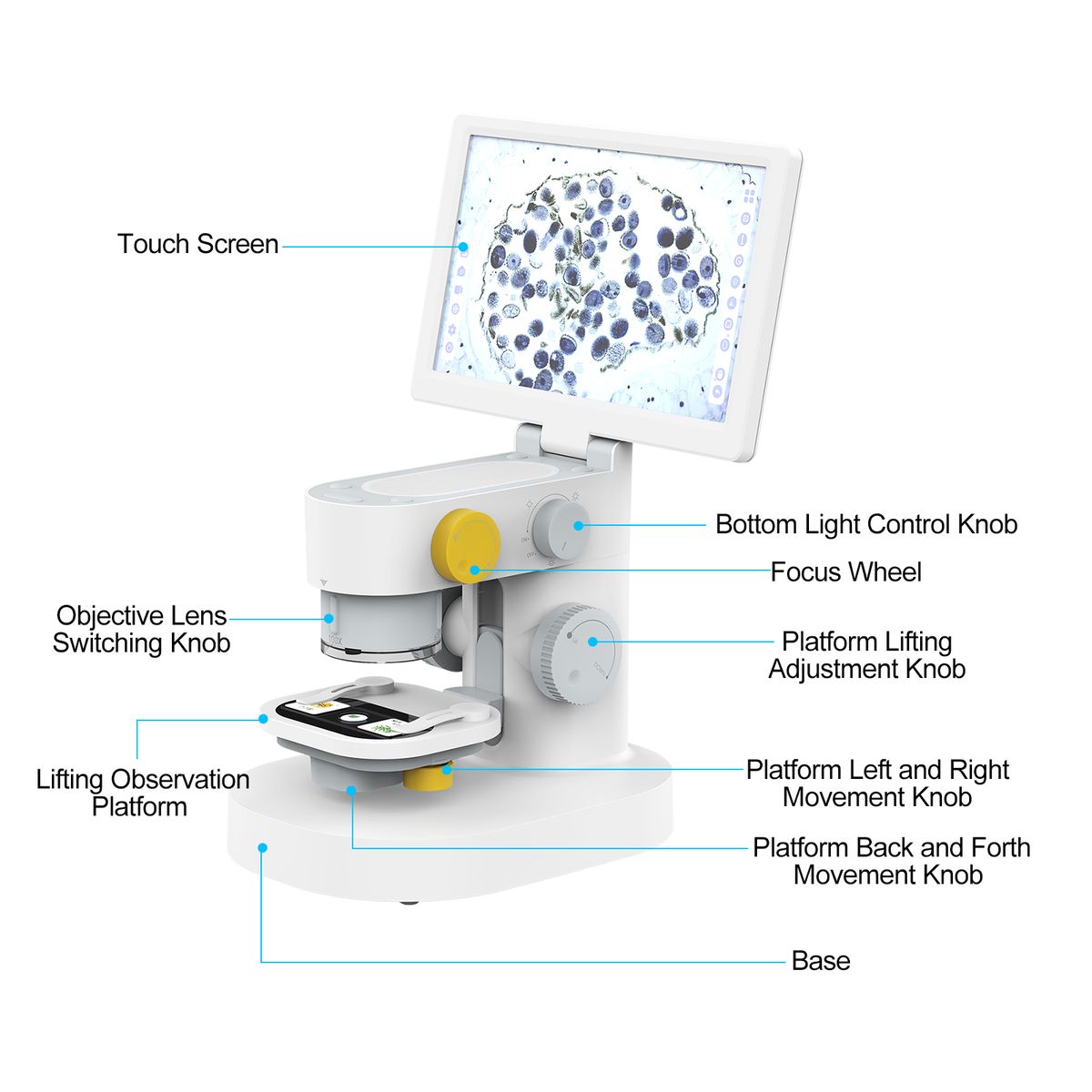 Integrated Design with 9-inch Touch Screen, Intelligent Control: the display screen is also a control panel, just tap the screen to call/hide the option interface. Built in image measurement and drawing function for real-time measurement and editing, convenient and intelligent. The large screen can be folded down when not in use, save more space for your desktop.