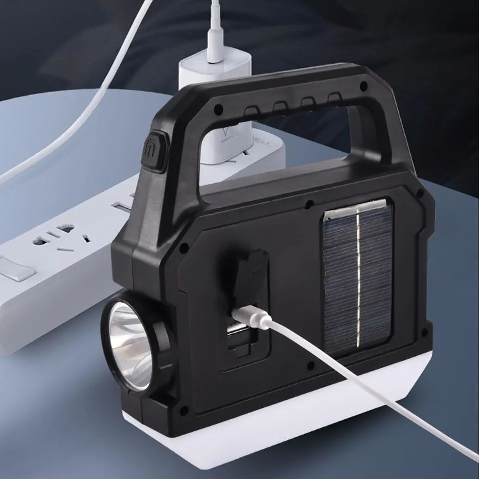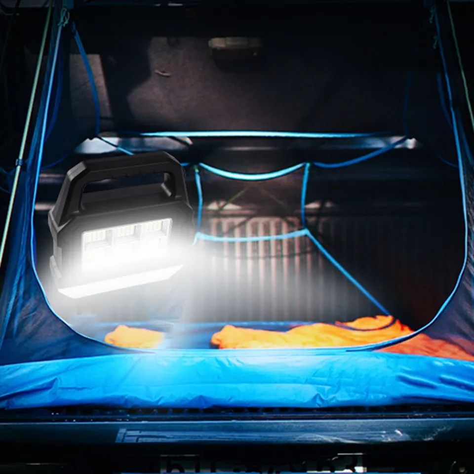 Features1. Functions: Multi lamp design, floodlight, long range, intelligent switch, anti-skid handle, durable2. Gear position: Middle lens: strong light - weak light - flash; 2 side floodlight: strong light - weak light; LED light cup: strong light3. Power display: The camping lamp has smart power display, which can keep track of the battery condition and facilitate timely charging4. Charging mode: The two charging modes are solar charging panel, which can be charged by absorbing sunlight when working outdoors. Fast charging via Micro USB5. Multi function: The portable lamp is daily waterproof, which can be used as an emergency power bank when outdoors
