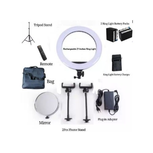 18 Inches Rechargeable LED Ring Light & ndash; M45 comes 3 phone holders, 2 rechargeable batteries, Mirror, Charger, Remote, Tripod stand, Adapter and bag,3 flexible gooseneck phone holder stand.It comes with 240 pieces of quality led light beads. With 5500K colour temperature and excellent colour rendering index =CRI & gt;95.