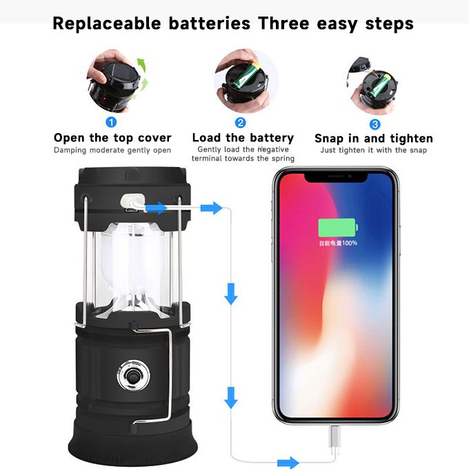 Features: Camping light, hand-held light, solar lamp, Charging your Phone, searchlight, tent light, emergency light