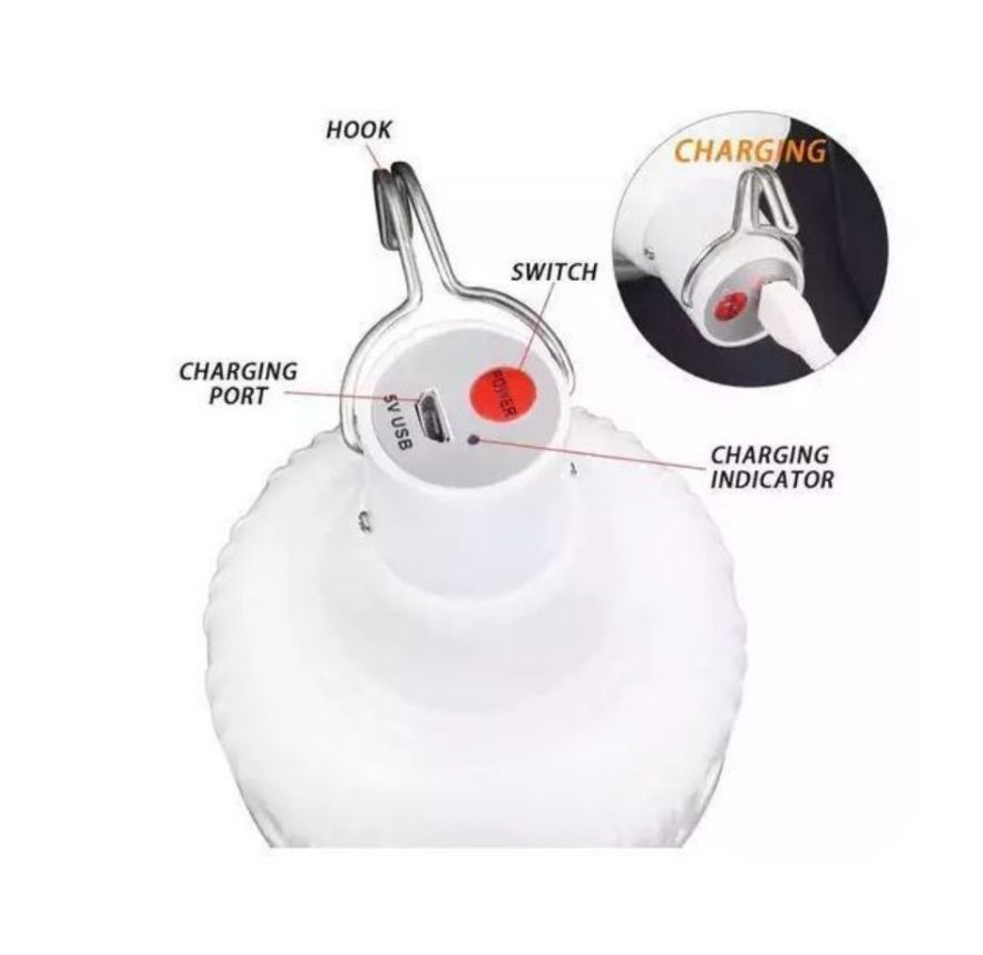 It comes with USB charging port Nd and a USB cable with charging indicator. The bulb also comes with an hanger for easy fixing and a power button. It can last for reasonable hours once recharged.