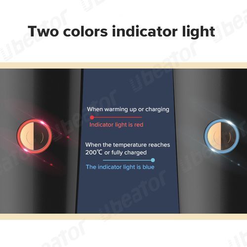 9.Two colors indicator light,When warming up or charging Indicator light is red,When the temperature reaches 200°C or fully charged The indicator light is blue,USB charging,When charging,the light turns red,and when fully charged, the light turns blue