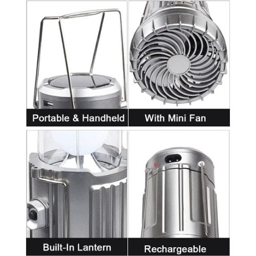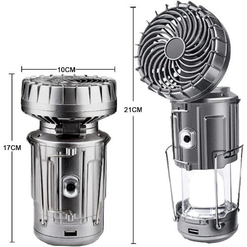 [Bright Lantern Flashlight] Whenever you need the light, our 4 in 1 Portable Outdoor LED Camping Lantern With Fan is ready for you to provide dependable light no matter where you are. [Function Of The Fan] Highling spotlight windy and light,folding Fan Cooler Outdoors. [Ceiling Fan With Lights] This low profile ceiling fan features a bright LED Lamp, which make it a basic gear for both indoor and outdoor use,perfect for camping and bedroom. [2 Kinds of Power Supply Methods] Solar, 5V DC USB charging, The red light next to the DC input is bright mean in charging, Making sure you have light with you at anytime. [Solar Charging] [USB Charger For Emergency] [Bright LED Lamp] Using 6 class led lamp for high energy saving light of soft shadow light and light cup light of high quality high reflectivity.