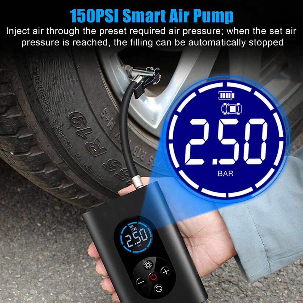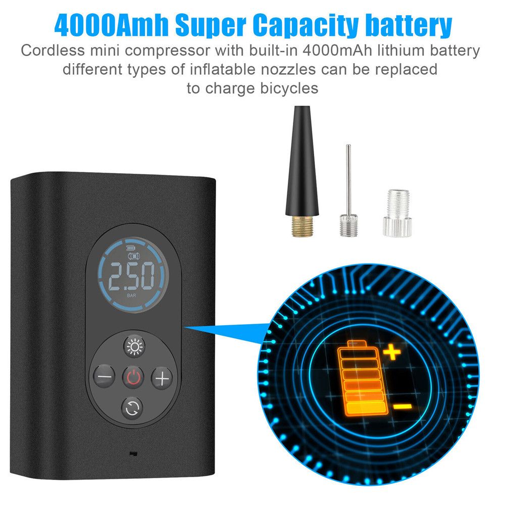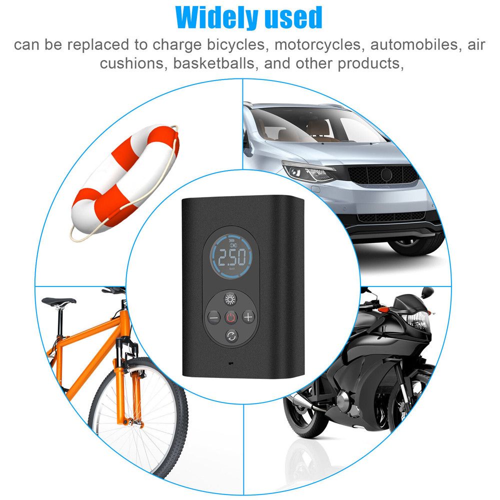 Multifunctional and powerful -Portable air compressor is equipped with 4 nozzle adapters. The perfect design is used for various bicycle tires, home tires, motorcycle tires, electric bicycle tires, balls, swimming rings, toys, other inflatable expansion and expansion