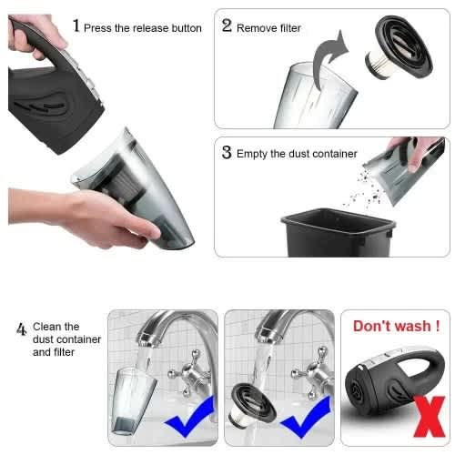 A rechargeable cordless vacuum cleaner with an LED light that helps you easily clean anywhere and any corner, vacuum absorbs hair on the sofa, food crumbs, keyboard space dust, cigarette ash, breadcrumbs on the desk, dust in the car, paper or pencil clippings, small debris in the bagThe latest generation of portable mini vacuum cleaner now offers a high capacity 2000mAh lithium-ion battery and a cleaning time of up to 20-25 minutes after fully charged.Handheld portable vacuum cleaner providing 4500pa suction, perfect for daily quick cleaning for home, office, pets, car, keyboard, makeup bag, a computer without bulky and tangled laces, helps you clean easilyLightweight car vacuum has 2 different nozzles for different cleaning purposes, thorough cleaning, no dead angle, delicate design that can reach every corner of your car.Powerful easy suction cyclone to remove dust from anywhere washable HEPA filter keeps Powerful suction increased dust cup capacity to meet the need for dirty deep cleaning needs of your kitchen bedroom bedroom