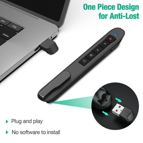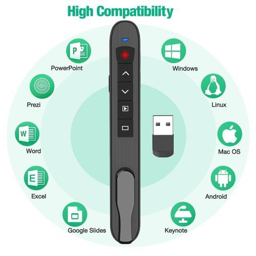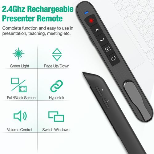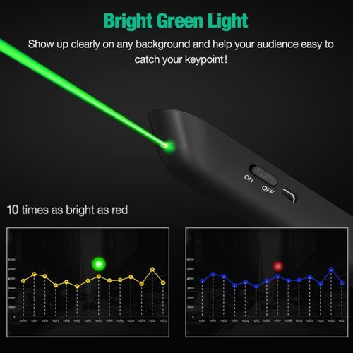 Features:【Presentation Clicker/Cat Toy with Bright Green Light】10 times brighter than a red light, bright green laser pointer that is easy to see against most background, highlight key areas of your slides, brilliant green light laser pointer helps you get their attention—and keep it. The green pointer laser is very bright, as a toy is ideal to play with your cats and dogs!【Multi-features Rechargeable Presentation Remote】PowerPoint remote supports various functions: hypeink, volume control, switch windows, full/black screen, page up/down. With built-in 360mAh rechargeable lithium battery, the wireless presenter can work up to 7 days after charging 1 hour. A battery power indicator ensures you finish your presentation.【Wireless Clicker with 82ft Wireless Control Range】Wireless remote control distance range of up to 82-foot, so you can free to move around the room and communicate with your audience, helps you make ordinary presentations extraordinary. The Green light can reach 330 ft range, suitable for classroom, meeting room, school hall, church etc.【Plug & Play PowerPoint Clicker】No need any drivers, just plug the usb dongle into a usb port, compatible with Windows 7 or later, Mac OS 10.10 or later, Linux,Android 4.3 or later,supports PowerPoint, Keynote, Prezi and etc. For Mac users, follow a simple set-up for identify the presenter.【Clip Design】Apart from features intuitive touch-keys for easy slideshow control, the clip design allows you attach it to your book or pocket, No need to worry losing your Presentation Clicker anymore!Package list:1x Presenter Remote1x Pouch Case1x User Manual1x USB Cable