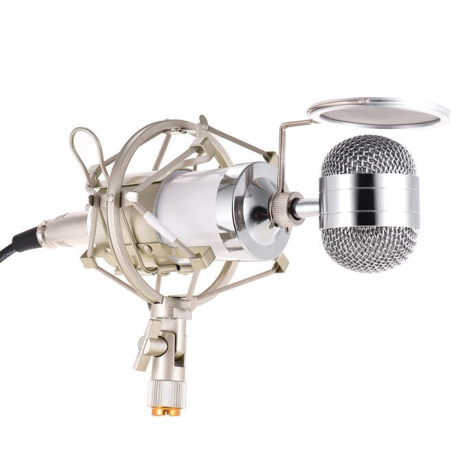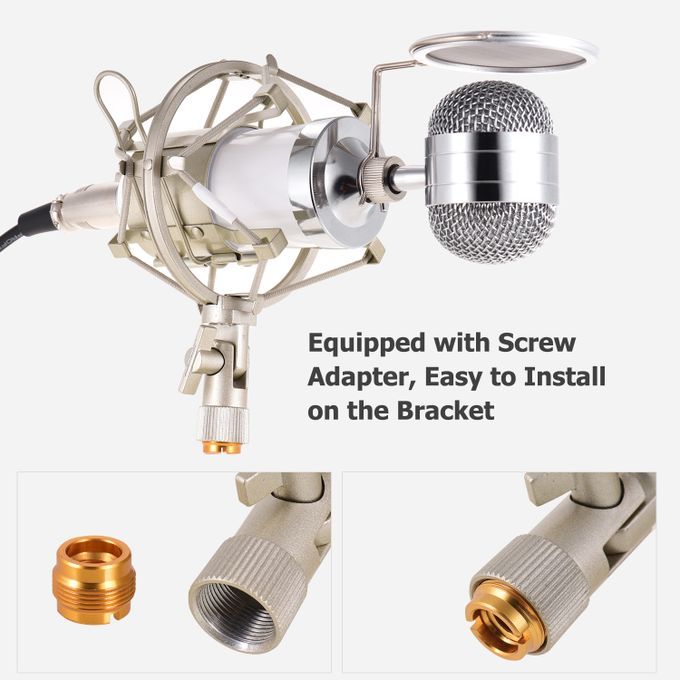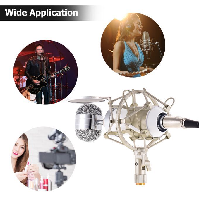 The professional conderser microphone is designed for recording, comes with useful accessories including mic windshild, metal shockproof clamp, 3.5mm male to XLR female cable.