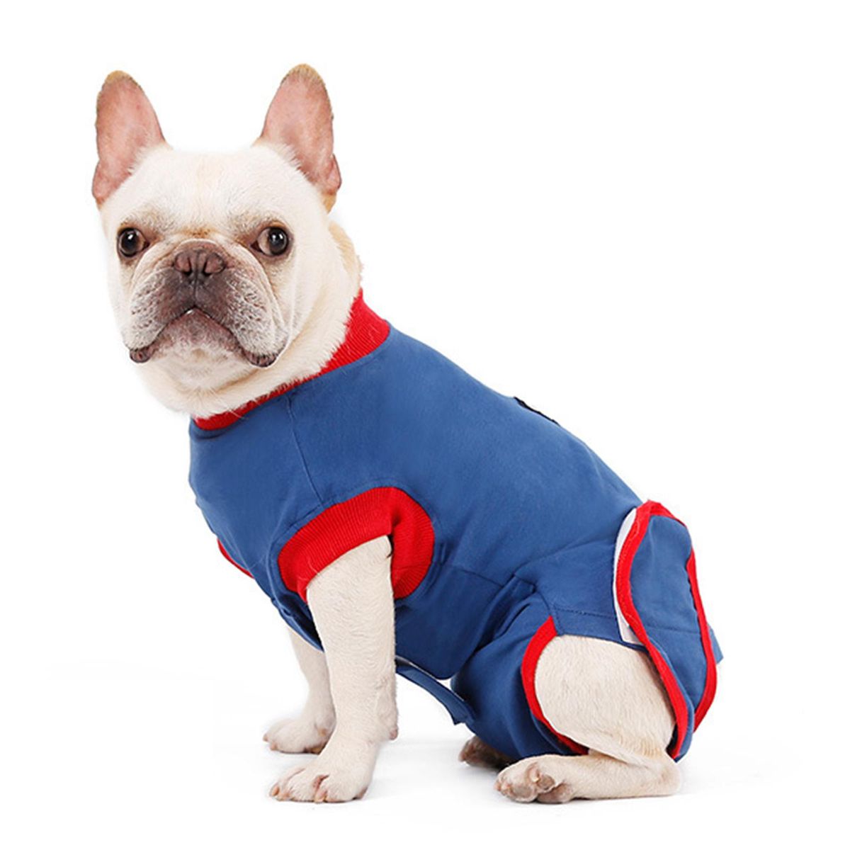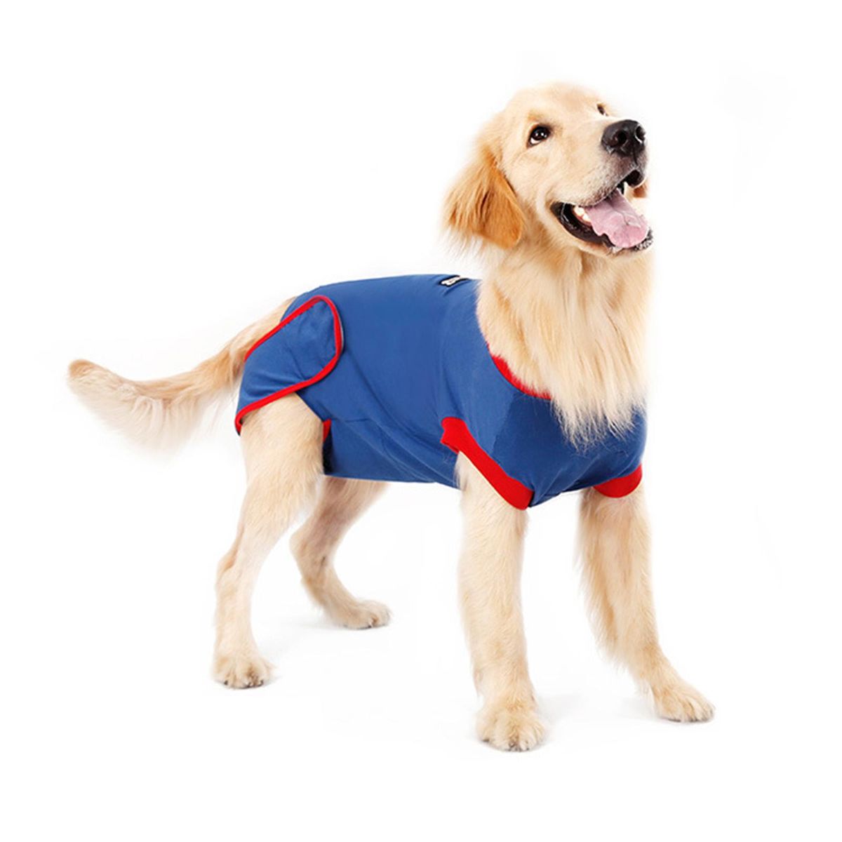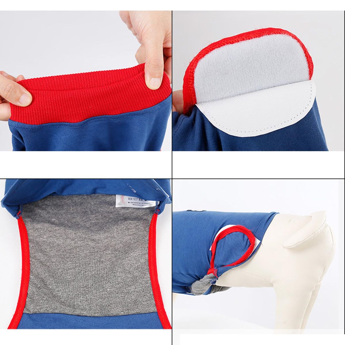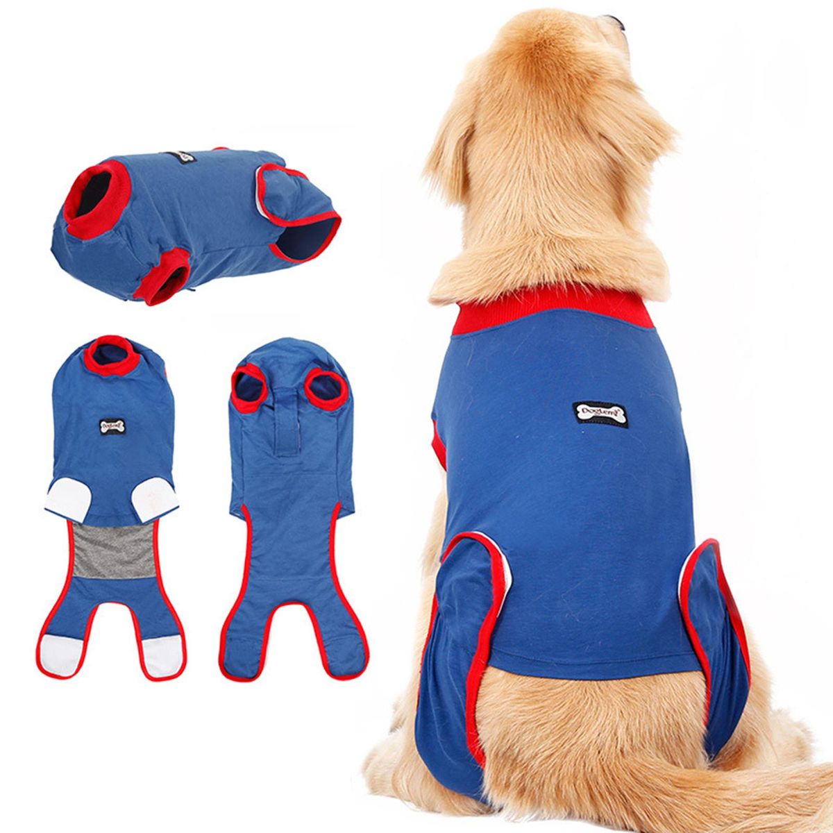 HIGH ELASTIC COTTON FABRIC : Our dog recovery suit is made of Cotton material, Soft, breathable, and comfortable to wear. Won't limit the pet's activities when wearing it. SNUGGLY FIT : The recovery suit wraps your pet, The clothes are super soft and elastic with strong wrapping, dogs feel like snuggly the owner's in it, can comfort the dog.SOFT TO WEAR: Your pets can eat/sleep/play/daily walk freely when wearing this recovery suit and won't be annoyed. Unfasten the rear part and roll it up with the stick fastener, then dogs can pee/poop freely.EASY TO PUT ON/TAKE OFF : It's convenient to wear due to the widened sticky buckle at the back waist part. Allows your dog to do anything without feeling obstructed. Use as after surgery wear for dogs, more care for dogs.SMALL TO LARGE DOGS :. The Recovery Suit is suitable for all sizes of male/female dogs.