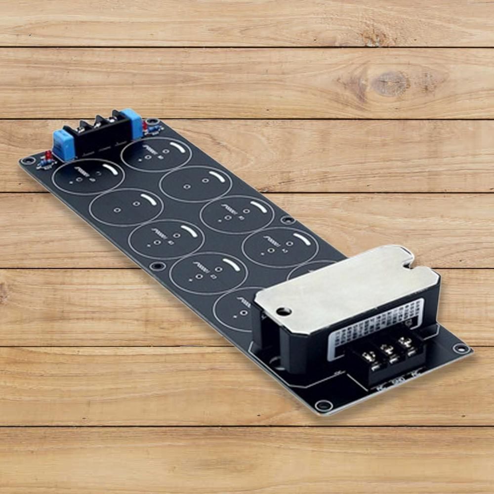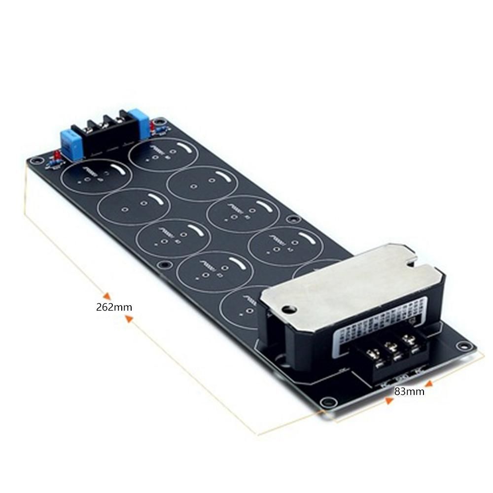 The board can hold 8 capacitors with a maximum diameter of 35mm and a pitch of 10mm.