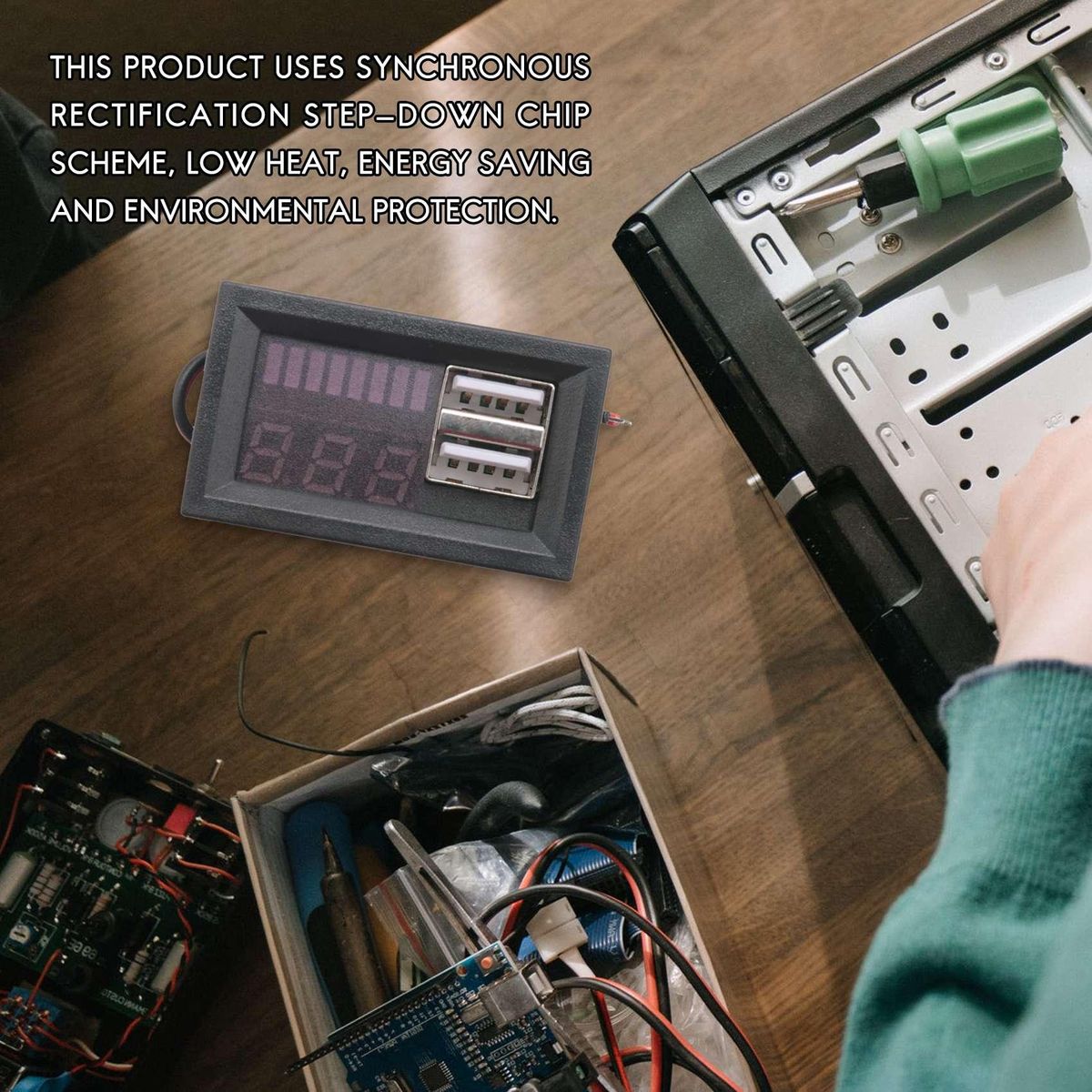 this product uses synchronous rectification step-down chip scheme, low heat, energy saving and environmental protection.