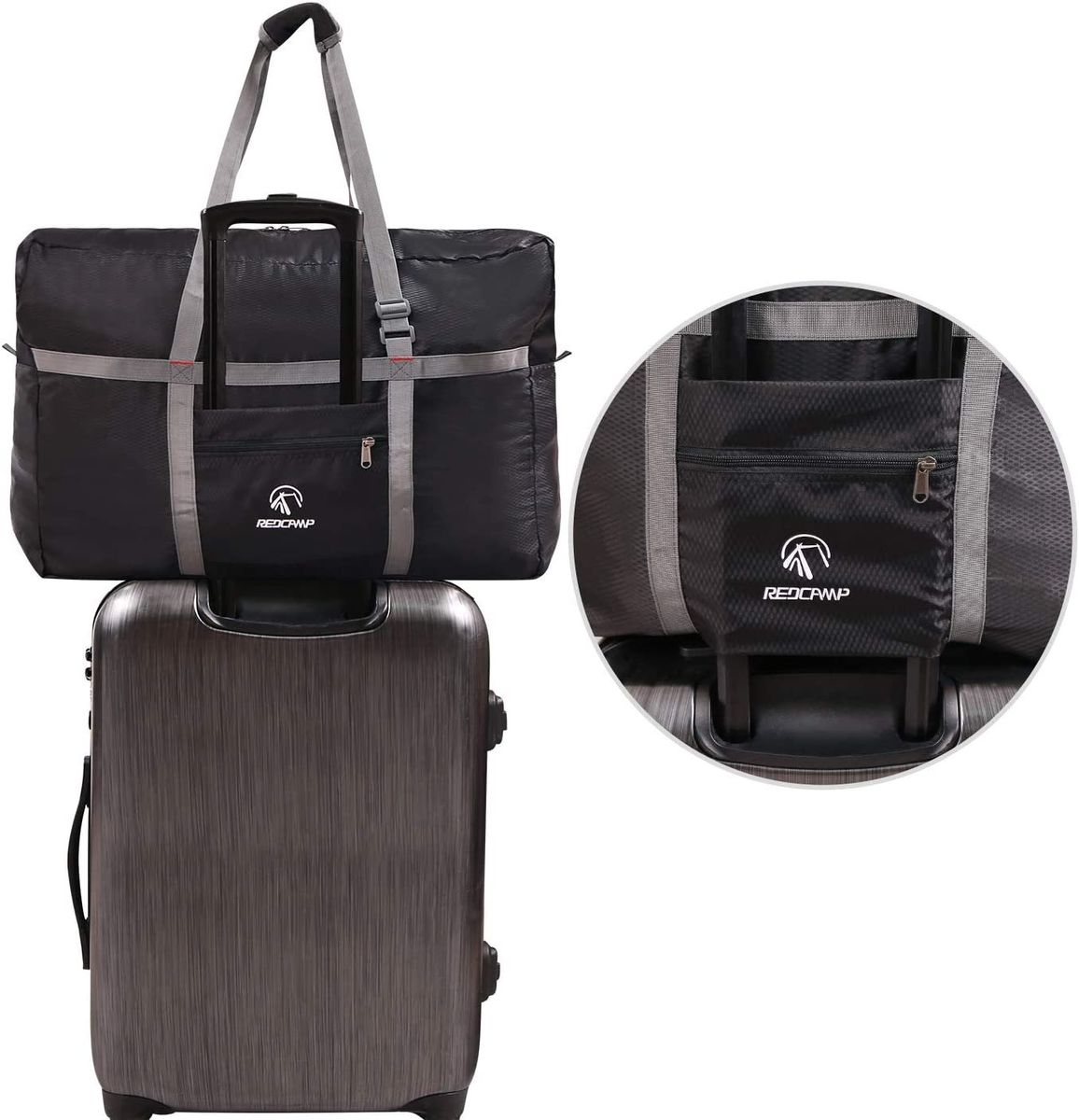 - POCKETS:The REDCAMP large duffel bag is equipped with 3 outside pockets with 3 open mesh pockets on the side. It also has an interior pocket that the duffel bag folds into when not in use.