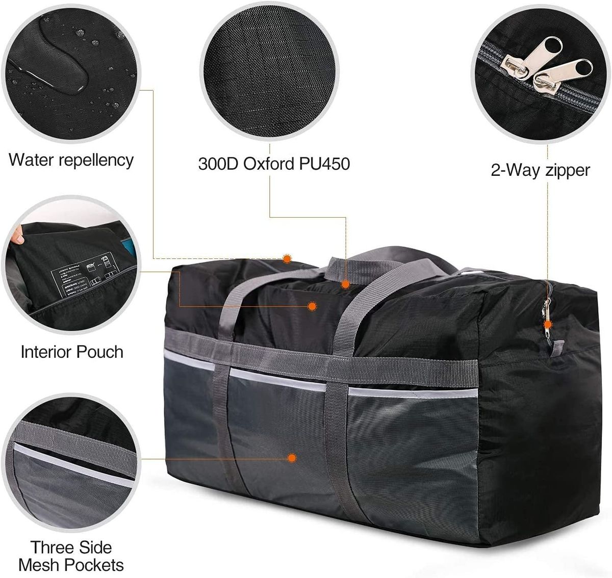 Water resistant travel duffle bag is made out of high quality 300D Oxford PU450 fabric, resisting wear and tear. | Convenient zippers to open or close the bag, The REDCAMP large duffel bag is equipped with 2-way zippers. | Hidden Interior Pocket design, you can fold it into the interior pouch when the bag is not in use. |