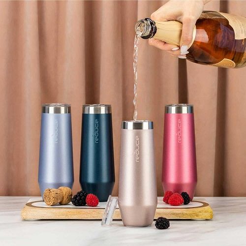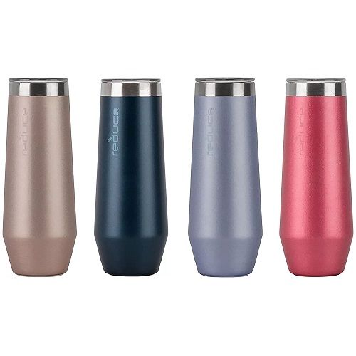 Holiday Party Ready - This set includes 4 Stemless Flutes with lids (8 ounces). They are great tumblers for all kinds of fizz, including Prosecco, Cava & Mimosas.Perfect for Celebrations - These cups make ideal celebration cups and holiday party cups. They are also convenient camping and picnic flutes.The Right Temperature - The stainless steel flutes are dual-wall vacuum insulated to keep drinks chilled for up to 20 hours.Easy Care - Dishwasher safe for quick and easy cleanup. Each stemless flute features a non-slip silicone base to prevent New Year's Eve party fouls.Extra Details - Sweat-proof & shatter-proof tumblers. 18/8 food-grade stainless steel flutes. Brand: REDUCEMaterial: Stainless Steel, SiliconeColor: Assorted (4 Pack)Capacity: 8 OuncesStyle: ModernOccasion: PartyIncluded Components: LidShape: FluteProduct Care Instructions: Machine Wash, Hand Wash OnlyUnit Count: 4 CountProduct Dimensions: 5.5"W x 5.25"HNumber of Items: 1Item Weight: 1.85 poundsManufacturer: REDUCE