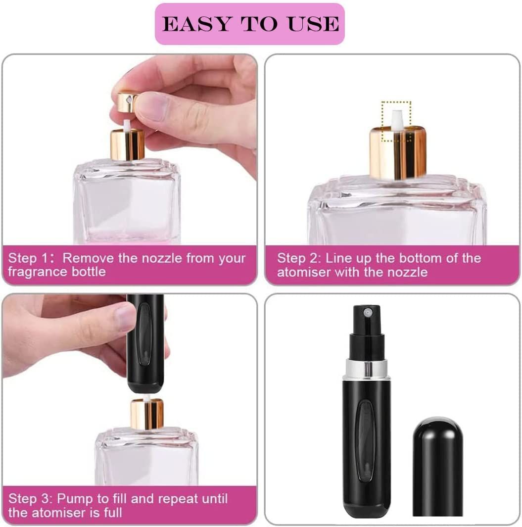Simple Operation In 3 StepsStep 1: Open the perfume bottleStep 2: Align the bottom micro absorber at the mouth of the perfume bottleStep 3: Divide the bottle up and down repeatedly to fill up the perfume